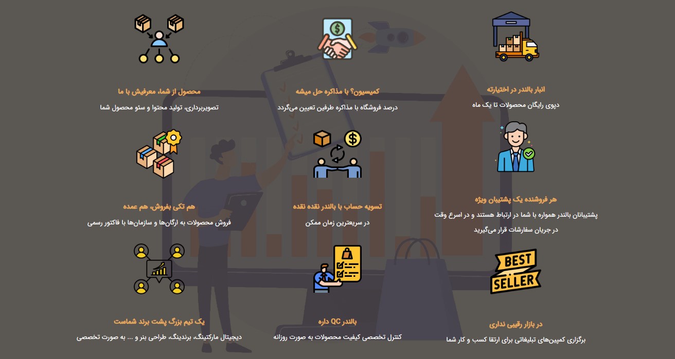 فروشگاه اینترنتی و حضوری بالندر با بیش از 10.000 نفر بازدید روزانه توسط کاربران تخصصی صنعت مبلمان و دکوراسیون، بستری را برای شما فراهم کرده تا بتوانید هر نوع محصولی را که دارید، بدون محدودیت در تعداد و تنوع آن‌ها، از طریق سایت و ‌نمایشگاه‌های بالندر به فروش برسانید. در این مسیر بالندر با استفاده از مشاوره‌های تخصصی و تبلیغات گسترده، به رشد و ارتقای بیش از پیش برند شما کمک خواهد کرد.