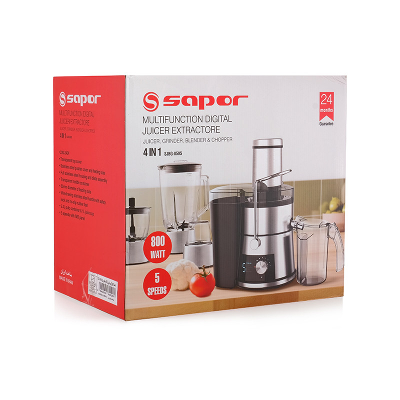 آبمیوه گیری ساپر مدل 850S، یک محصول با طراحی بسیار زیبا، کیفیت ساخت بالا، موتور بسیار قدرتمند و قیمت مقرون به صرفه است. این محصول در حالت ۴ کاره دارای ( آبمیوه گیری، خرد کن، آسیاب، مخلوط کن) شیشه پیرکس با بدنه استیل، مخزن تفاله و تیغه استیل ضد زنگ تولید می شود. از دیگر مشخصات این محصول میتوان به قابلیت تنظیم سرعت به ۲ حالت، فناوری ضد چکه، فیلتر قابل شستشو، قابلیت شستشوی لوازم جانبی در ماشین ظرف شویی، دارای دهانه ضد زنگ و بدنه یکپارچه استیل اشاره کرد. آبمیوه گیری ساپر مدل 850S به یک موتور قدرتمند ۸۰۰ وات هم مجهز است.