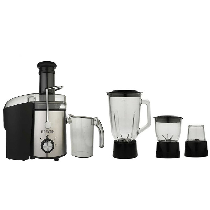 آب میوه گیری دنور مدل DR-7799 POWER یک دستگاه با موتور قدرتمند 1000 وات است که می تواند به راحتی نیازهای مختلف شما را برآورده کند. جنس بدنه جنس بدنه از استیل ضدزنگ است که باعث می شود دستگاه برای مدت طولانی در برابر زنگ زدگی مقاوم باشد. دهانه ورودی با سایز 70 میلی لیتر اجازه می دهد تا میوه های بزرگ را بدون نیاز به برش کوچکتر، در دستگاه قرار دهید. این آبمیوه گیری صدای کمی دارد و استفاده طولانی از آن اذیت کننده نیست. همچنین دارای یک مخزن تفاله گیر با گنجایش 2 لیتر و یک پارچ آبمیوه با گنجایش 1 لیتر دارد که با توجه به این ظرفیت شما قادر خواهید بود بدون نیاز به خالی کردن زود به زود تفاله گیر و پارچ، آب مقدار زیادی از میوه ها را بگیرید. این دستگاه دارای دو سرعت مختلف است که باعث می شود بتوانید سرعت آبگیری را بر اساس نوع میوه تنظیم کنید. این مدل دارای مخلوط کن – خرد کن و یک آسیاب نیز میباشد با ویژگی های ذکر شده می توان گفت آبمیوه گیری دنور مدل DR-7799 POWER یک انتخاب عالی برای هر آشپزخانه ای است.