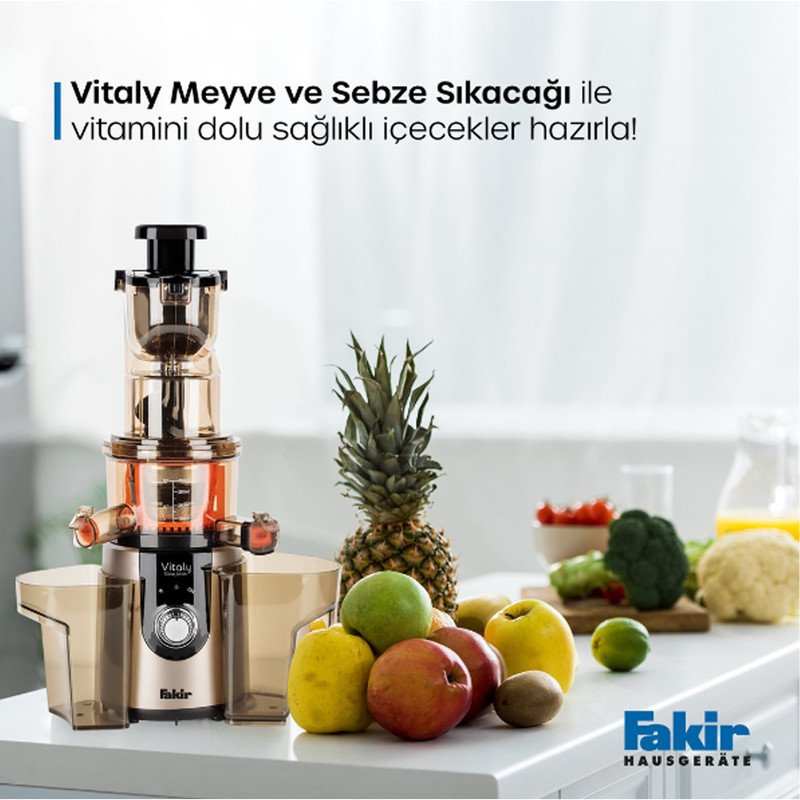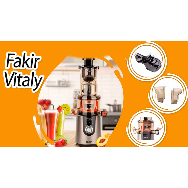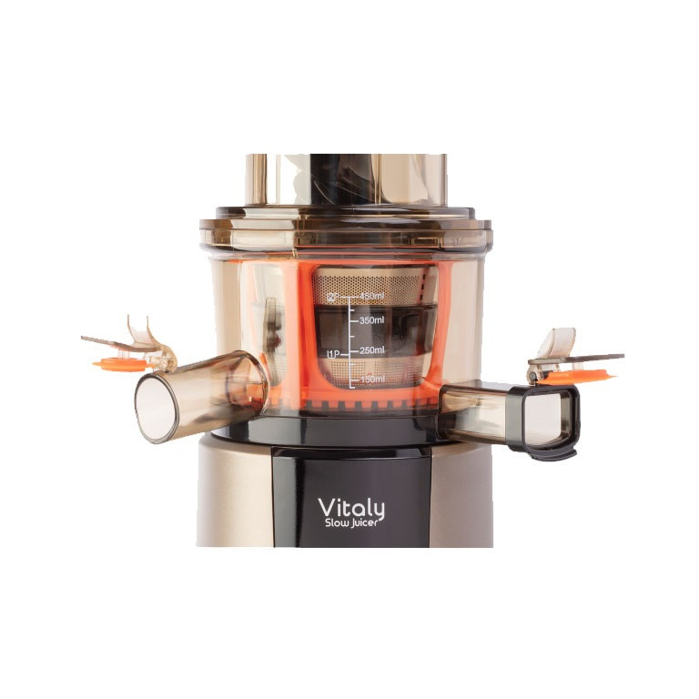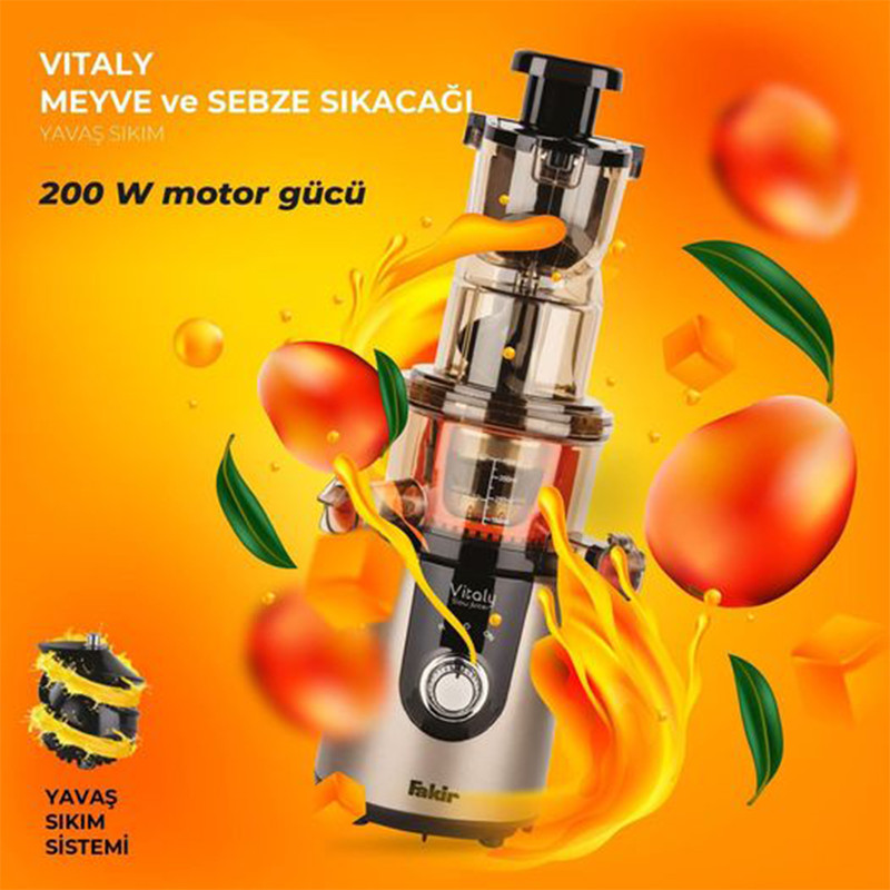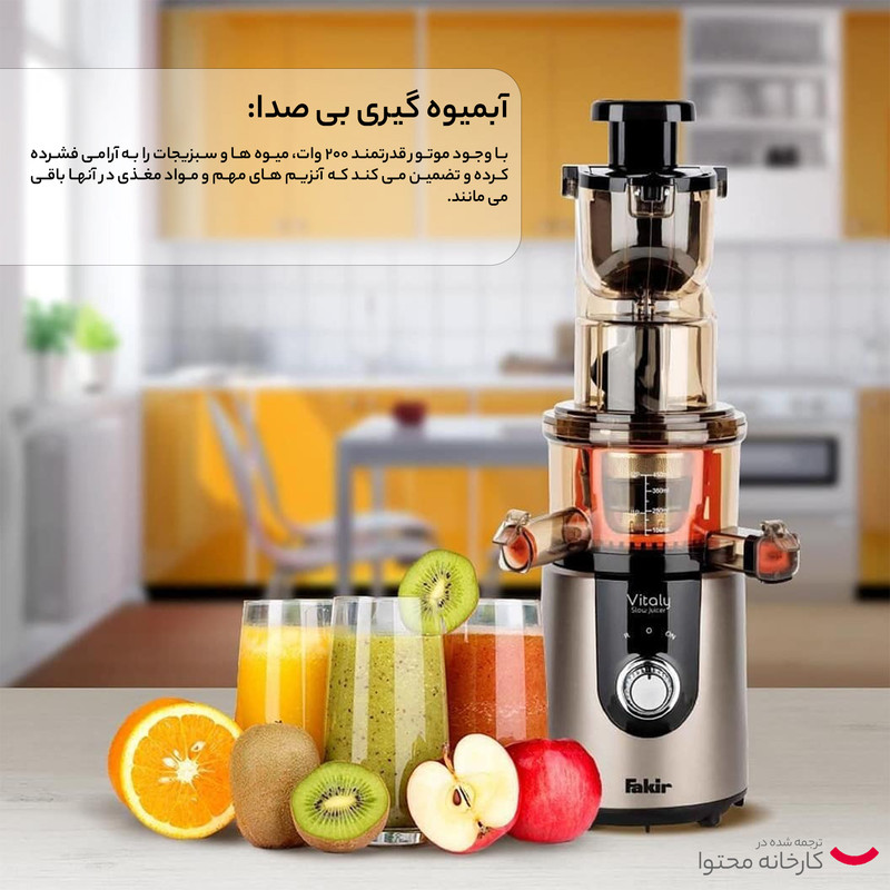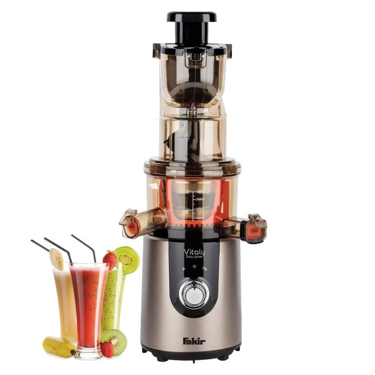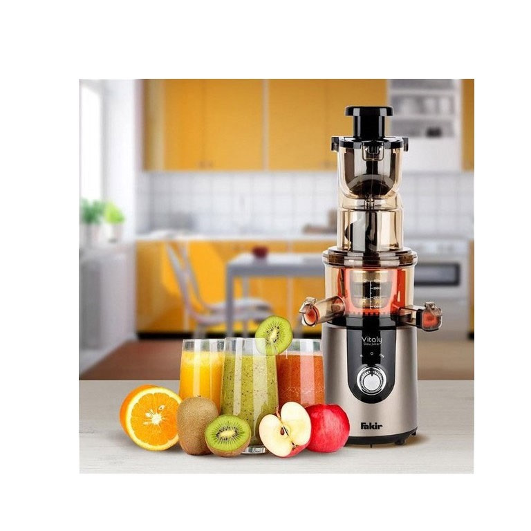 | امکانات و قابلیتها | توان : 200 وات (موتور گیربکسی) ،قابلیت گرفتن آب و عصاره انواع میوه های هسته دار و بدون هسته وسبزیجات ، قابلیت میکس کردن آب چند میوه ، درصد آبگیری خیلی بالا و تفاله خشک ، دارای دو پارچ برای آب میوه و تفاله ظرفیت ظرف اصلی : 1 لیتر ،ظرفیت مخزن تفاله : 0.8 لیتر ،نوع موتور : DC ، سیستم ضد چکه : دارد ، پایه ضد لغزش : دارد ، عملکرد معکوس : دارد برای هنگام گیر کردن ، سرعت دستگاه : 60rpm دور در دقیقه سیستم :SLOW SQUEEZING چلاندن به آرومی آبمیوه گیری فکر پالپی مدل VITALY دستگاهی خوش ساخت می باشد که ظاهری شبیه به عصاره گیر دارد و رنگ بدنه ی آن نیز نقره ای می باشد. شما می توانید به وسیله ی این دستگاه نوشیدنی های متنوعی را تهیه کنید. به ویژه در فصول گرم سال مانند تابستان که مصرف نوشیدنی های خنک و متنوع بسیار زیاد می شود، وجود چنین دستگاهی در هر خانه می تواند کارساز باشد. همانطور که می دانید مصرف آبمیوه های طبیعی تبدیل به امری مرسوم در جامعه ی امروزی شده است. و اکثر افراد برای حفظ سلامتی جسم خود ترجیح می دهند که از آبمیوه های خانگی و طبیعی استفاده کنند. جنس بدنه ی این محصول از پلاستیک مقاوم ساخته شده است که در مقابل ضربه ها و فشارهای مختلف دچار آسیب نخواهد شد.تفاله گیر : یکی از مهم ترین مزیت های این دستگاه آبمیوه گیری این است که دارای مخزن تفاله گیر می باشد. وجود مخزن تفاله گیر سبب می شود که تفاله های میوه های مختلف در این مخزن قرار بگیرند و وارد نوشیدنی شما نشوند. در نتیجه نوشیدنی کاملا خالصی را می توانید به وسیله ی این دستگاه تهیه کنید. علاوه بر این، ورود تفاله به موتور دستگاه آبمیوه گیری میتواند آسیب های جدی به آن وارد کند که وجود چنین مخزنی از این اتفاق نیز جلوگیری خواهد کرد. ظرفیت مخزن تفاله ی این دستگاه آبمیوه گیر برابر با هشتصد میلی لیتر است. تیغه : جنس تیغه های این آبمیوه گیر نیز از استیل ضد زنگ ساخته شده است. که مقاومت و دوام بالایی دارد و در اثر شستشوی پی در پی دچار زنگ زدگی نمی شود. این تیغه ها بسیار بُران هستند و به همین سبب به افزایش سرعت عمل دستگاه کمک شایانی می کنند. اجزای همراه :فرچه تمیز کننده و دسته فشار دهنده و کاسه ها |