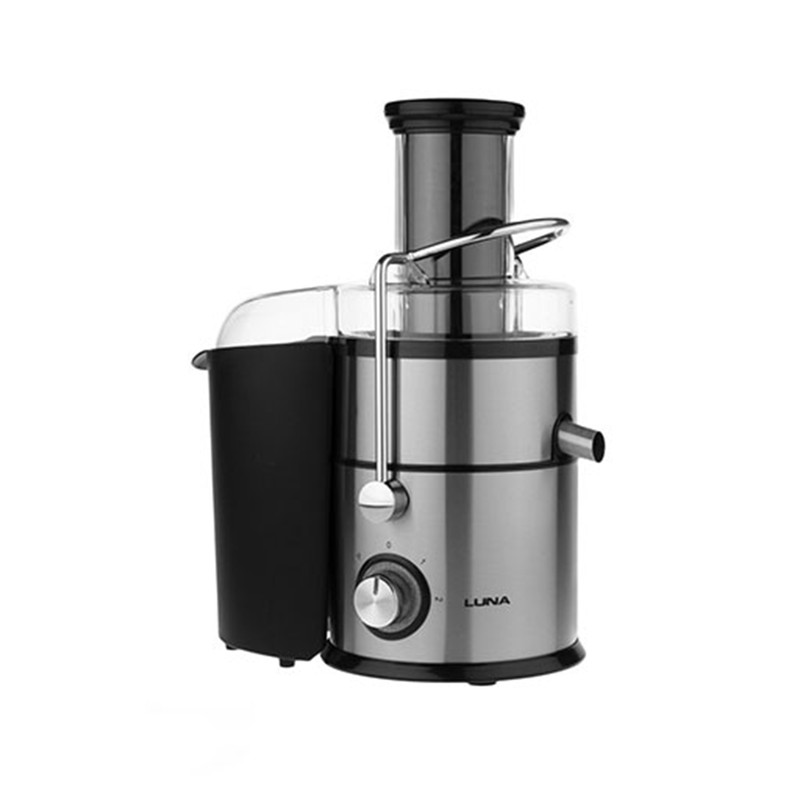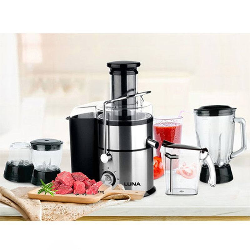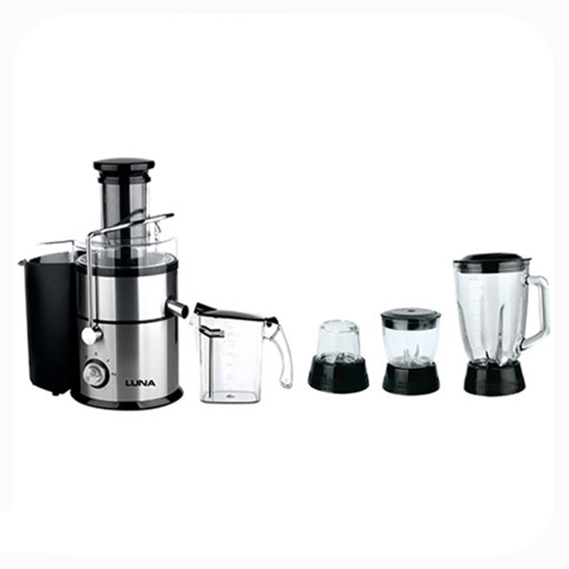 آبمیوه گیری 4 کاره لونا مدل «510» باتوان «800» وات یکی از تولیدات با کیفیت و کار آمد این شرکت است.این دستگاه با ظاهری زیبا و صد البته با کیفیت و کار آیی بالایش میتواند آبمیوه های مختلف از قبیل آب هویج .سیب …و نوشیدنی های بینظیر مانندشیر موز…را به بهترین نحوه ممکن تهیه کند.علاوه بر آبمیوه گیری به عنوان خردکن، مخلوط کن و آسیاب کاربرد دارد. بدنه و تیغه آبمیوهگیری از استیل ضد زنگ ساخته شده است.بر روی بدنه ولوم چرخشی روشن و خاموش و تنظیم سرعت موتور در دو حالت کم و زیاد همراه با عملکرد پالس (ضربه ای) تعبیه شده است. قطر بزرگ دهانهی آبمیوهگیری امکان ورود میوهی درسته (مانند یک سیب کامل) را بدون نیاز به خرد کردن آن فراهم میکند.فیلتراستیل ضد زنگ دستگاه به راحتی قابل شستشو است و به مرور زمان زنگ نزده و فرسوده نمیشود. لوازم جانبی این محصول نیزبه راحتی جدا شده و قابلیت شستشو در ماشین ظرفشویی را دارد.مجهز به سیستم پالس میباشد.پایه های استیل ضد لغزش زیر دستگاه مانع از جابجایی یا حرکت حین فعالیت می شود.کار آیی وطراحی این محصولات این شرکت خریداران را از خرید این محصول راضی نگه داشته است.