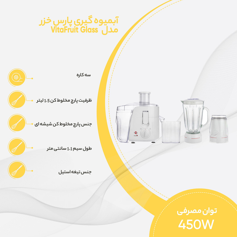 آبمیوهگیری «پارس خزر» مدل «VitaFruit Glass» دستگاهی با قابلیتهای متنوع بوده، که توسط این تولیدکنندهی داخلی تولید و به بازار عرضه شده است. این محصول چندکاره از قسمت اصلی آبمیوهگیری و قطعات مخلوطکن و آسیاب تشکیل شده است. مخزن آبمیوهگیری پلاستیکی درنظرگرفتهشده است، و 700 میلیلیتر ظرفیت دارد. تیغههای قدرتمند آبمیوهگیری از استیل ضد زنگ ساخته شدهاند و شستوشوی آنها بسیار راحت است. این محصول به مخزن تفاله نیز مجهز است که با گنجایش یک لیتر، زحمت تخلیهی سریع و پیدرپی تفاله را کم میکند. با نصب پارچ مخلوطکن روی بدنه میتوان موادغذایی مختلف را مخلوط یا میوههای گوناگونی مانند طالبی و هندوانه را آبگیری کرد. از طرفی قدرت تنظیم سرعت تیغهها یک امتیاز است که با در نظر گرفتن نوع فعالیت میتواند توسط مصرفکننده تنظیم شود. گردهمآمدن این سه کارایی در یک دستگاه و عرضهی آن توسط شرکت معتبر پارس خزر، این دستگاه را به انتخابی بهصرفه و کارآمد تبدیل کرده است.