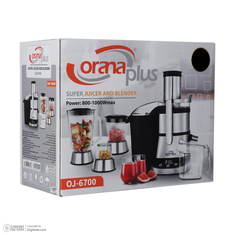 آبمیوهگیری مدل «OJ-6700» یکی از این محصولات کاربردی و خوشساخت برند «اورانا پلاس» است که عملکردهای متفاوتی دارد. این دستگاه علاوهبر قابلیت آبمیوهگیری دارای یک پارچ مخلوطکن است؛ همچنین یک عدد ظرف آسیاب و خردکن در کنار این دستگاه ارائه میشود. بدنهی این آبمیوهگیر از جنس پلاستیک ABS و از مقاومت مطلوبة برخوردار است . موتور 1000 وات دستگاه در 5 سرعت متفاوت کار میکند و از توان آبگیری فوقالعادهی برخوردار است. علاوهبراین در صورتی که سروکارتان با مواد سفت و سخت بیفتد، به کمک عملکرد پالس که با علامت P مشخص شده است، میتوانید از پس آنها برآیید. عملکرد پالس حالتی است که در آن موتور با سرعت زیاد و به صورت ناگهانی کار میکند و با کارکرد مخصوص خود امکان خردکردن مواد سفت را به کاربر میدهد. از دیگر ویژگیهای کاربردی این دستگاه دهانهی ورودی عریض آن است که بهراحتی میوههای درسته را در خود جای میدهد. مخزن تفالهای برای این دستگاه در نظر گرفته شده است. پایههای این مدل بهگونهای طراحی شدهاند که از لغزش دستگاه در حین کار جلوگیری میکنند.