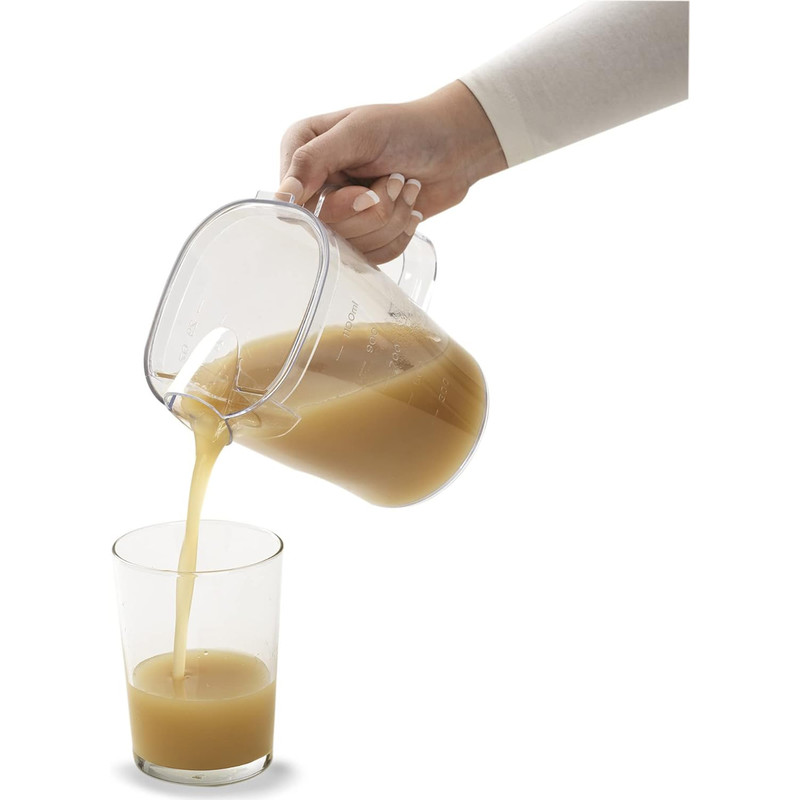 بدنه آبمیوهگیری از پلاستیک مرغوب و باکیفیت ساخته شده و قسمت بالایی آن طراحی شفاف دارد. به این ترتیب میتوانید بدون نیاز به بازکردن در آبمیوهگیری بر روند کارکرد دستگاه نظارت داشته باشید. قسمت درپوش به کمک سوئیچ ایمنی به قسمت اصلی بدنه قفل میشود. این مدل از قابلیت تنظیم سرعت برخوردار است. سرعت کم مناسب برای آبگیری میوههای نرم مانند هندوانه، انگور، گوجهفرنگی و خیار بوده و سرعت زیاد برای آبگیری میوههای سفت مانند سیب، هویج و چغندر است. علاوه بر قابلیت کارکرد در دو سطح، آب میوه گیری کنوود مدل JEP02، دارای عملکرد پالس یا لحظهای هم هست. گنجایش مخزن آبمیوهگیری به 0.85 لیتر میرسد. پس از قراردادن میوه در دهانه، با استفاده از فشاری همراه دستگاه میتوان میوه را به داخل دهانه هدایت کرد. گفتنی است فیلتر آبمیوهگیری از جنس استیل ضدزنگ ساخته شده که در اثر استفاده و به مرور زمان زنگ نزده و فرسوده نمیشود. برخورداری از سیستم ضدچکه در قسمت خروجی آبمیوه و همچنین مخزن تفاله از دیگر مزایای این مدل است که به بهرهوری بیشتر دستگاه منجر شده است.