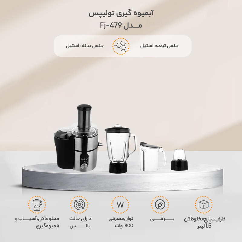 آبمیوه گیری تولیپس مدل FJ-479 از قدرت و کیفیت مناسبی برخوردار است. صدای ایجاد شده توسط این آبمیوه گیری مانند آبمیوه گیریهای قدیمی بسیار زیاد و آزار دهنده نیست. همچنین تیغههای آن از کیفیت مناسب ساخته شدهاند و بسیار تیز هستند. برای خرید یک آبمیوه گیری خوب به قطر دهانه آن توجه کنید. امروزه اکثر آبمیوه گیریها، برای راحتی کاربران با قطر دهانه بزرگ ساخته شدهاند. بزرگ بودن قطر دهانه، یکی از مزیتهای یک آبمیوهگیری خوب محسوب میشود چرا که به شما این امکان را میدهد تا میوههای کوچک و متوسط را بدون نیاز به برش آبگیری کنید. یک پارچ مخصوص برای آبمیوه گیری تولیپس مدل FJ-479 طراحی شده است تا در برابر دهانه خروجی قرار گیرد و آب میوه در آن جمع آوری شود. کاربران گرامی میتوانند از ظرف دلخواه و مناسب نیز برای جمع آوری آب میوه استفاده کنند. محفظه جمع آوری تفاله که در قسمت کناری محصول قرار دارد از پلاستیک ساخته شده است. همچنین این محفظه از ظرفیت مناسبی برخوردار است و نیاز به تخیه پی در پی در استفاده طولانی مدت ندارد. مخلوط کن این محصول دارای یک پارچ مخصوص مخلوط کن است که به بدنه اصلی و موتور دستگاه متصل میشود و دستگاه به راحتی تبدیل به یک مخلوط کن میشود. پارچ مخلوط کن از شیشه مرغوب ساخته شده است که حالت شفاف دارد و مواد درون آن دیده میشوند. در این پارچ دارای جایگاه مخصوص برای اضافه کردن مواد در حین کار است. با وجود این جایگاه مخصوص، میتوانید انواع مواد مانند شکر و… را در حین کار کردن دستگاه و بدون نیاز به خاموش کردن موتور اضافه کنید. آسیاب بهمراه آبمیوه گیری تولیپس مدل FJ-479 یک آسیاب کوچک نیز وجود دارد که برای استفاده از آن نیز باید آن را به موتور دستگاه متصل کنید. تیغههای آسیاب نیز از جنس خوب ساخته شدهاند و بسیار تیز هستند که به سرعت موادی مثل گردو و… را آسیاب میکنند، سرعت مختلف این محصول دارای دو سرعت کم و زیاد و عملکرد پالس است. با توجه به نیاز خود و نوع مواد، امکان استفاده از سرعت مناسب وجود دارد.