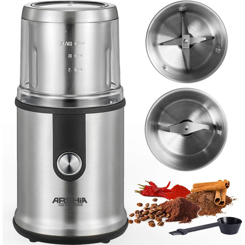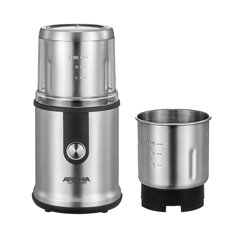 آسیاب برقی دوکاسه خشک و تر عرشیا مدل CG106-2568 دارای قدرت 400 وات و ظرفیت 110 گرم می‌باشد. سیستم قفل ایمنی دارد و تیغه آن استیل ضد سنگ می‌باشد. سوئیچ دکمه برای کاربرد آسان دارد.این آسیاب برقی دارای دوکاسه هست که از جنس استیل درجه یک هست که یک کاسه دارای تیغه دوپره هست که برای پودرن کردن دانه های خشک مثل دارچین زنجبیل هل فلفل سیاه فلفل قرمز قهوه برنج خشک و…. و همچنین برای پودر کردن انواع سبزیجات خشک مثل نعنا استفاده کرد و کاسه دیگری دارای یک تیغه چهار پره هست مخصوص دانه های چرب و خیس مثل گردو بادام سیر و … هست. آسیاب برقی مدل CG106-2568 یکی از محصولات بسیار با کیفیت از برند عرشیا می‌باشد. همانطوری که می‌دانید برند عرشیا دارای تنوعی بیش از 100 نوع کالای برقی از لوازم کوچک آشپزخانه در بازار ایران است. که می‌تواند برای مصرف کننده بسیار جذاب باشد و در کنار سایر محصولات آشپزخانه با این برند قرار بگیرد و فضای یک دست و زیبایی را در آشپزخانه شما ایجاد کند. این آسیاب همچنین می‌تواند برای خرد کردن دانه‌های چرب و لوبیا و سایر حبوبات و همچنین ادویه‌جات هم استفاده شود. و این محصول دارای قفل ایمنی می باشد که سبب بالاتر رفتن ایمنی استفاده از آن می‌شود. محل جمع آوری سیم در این دستگاه دیده شده است و همچنین برای بالا بردن قابلیت استفاده از آن دارای سیم بلند می باشد.