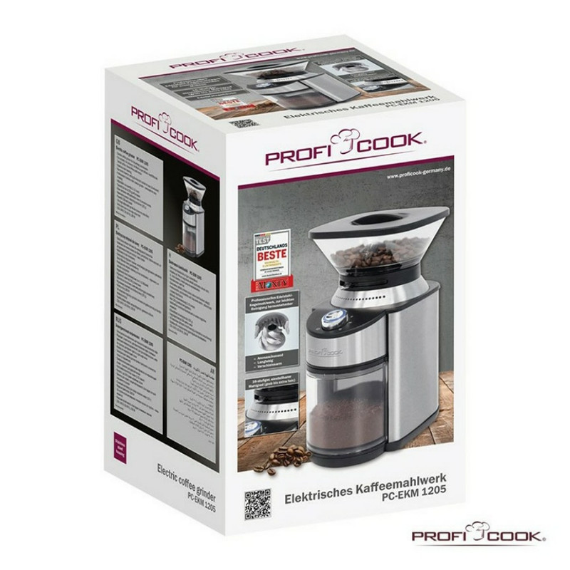 آسیاب قهوه پروفی کوک مدل 1205 دارای تعداد کاسه تک کاسه، دارای توان 200 وات، دارای پایه ضد لغرش، دارای محل جمع آوری سیم، دارای سیستم ایمنی مداری، نوع تیغه تیغه مخروطی، جنس تیغه استیل ضد زنگ، دارای سیستم حفاظت در برابر ولتاژ بیش از حد، دارای سیستم حفاظت در برابر گرمای بیش از حد، دارای قابلیت تنظیم میزان خرد شوندگی دانه ای قهوه در 12 سطح، مجهز به تایمر بر اساس تعداد فنجان، دارای لایه های ضد لغزش، مجهز به درپوش مخصو ظرف دانه ای قهوه برای حفظ طعم و بوی قهوه، دارای ظرفیت مخزن دانه قهوه 230 گرم، دارای ظرفیت مخزن پودر قهوه 125 گرم، امکان تعیین میزان درشت و یا ریز بودن پودر در 16 حالت متفاوت، استفاده از تیغه مخروطی استیل امکان تهیه پودر مخصوص قهوه ترک، قهوه فرانسوی و …، امکان تعیین تایمر بر اساس فنجان از 2 تا 12 فنجان، دارای وزن 2.31 کیلو گرم می باشد.