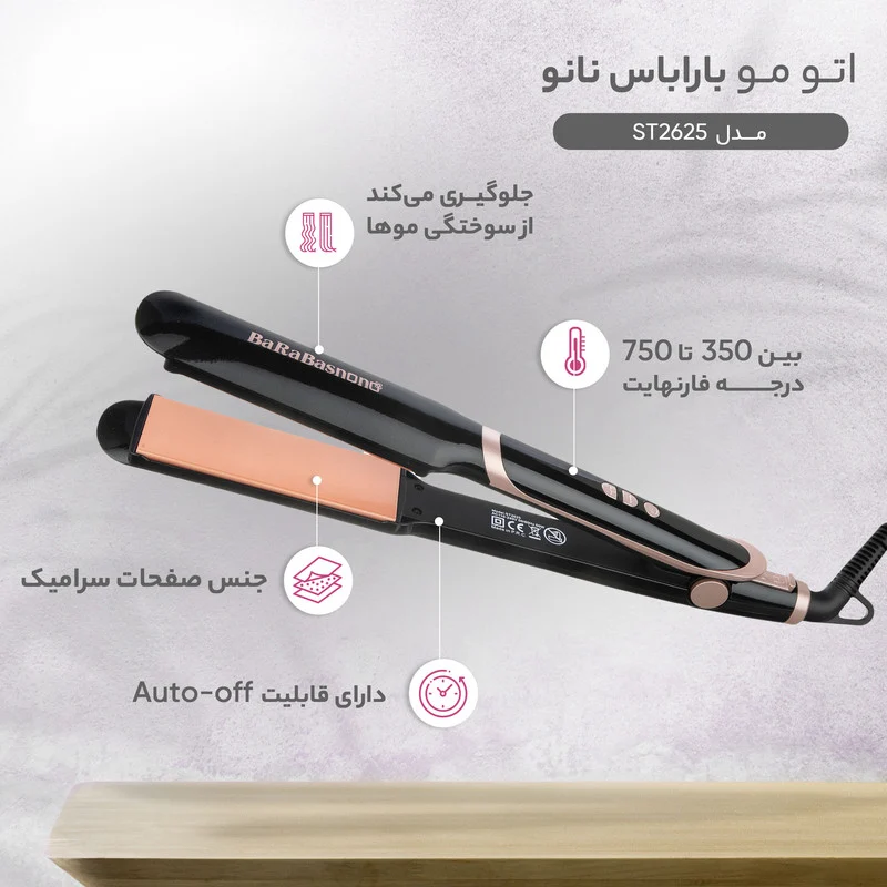 برند باراباس نانو دارای محصولات متنوع و حرفهای است که در سالنها برای آرایشگران و حتی مصرف کنندگان در منزل مناسب است. اتو مو باراباس نانو مدل ST2625 محصولی با طراحی نوین که در عین زیبایی، دارای صفحات سرامیکی است. صفحههای سرامیکی حرارت را به طور یکنواخت توزیع کرده و از سوختگی موها جلوگیری میکند. با توجه به ظرفیت گرمایی بالای سرامیک ، صفحه سرامیکی گرمای خود را برای مدت طولانی حفظ میکند.