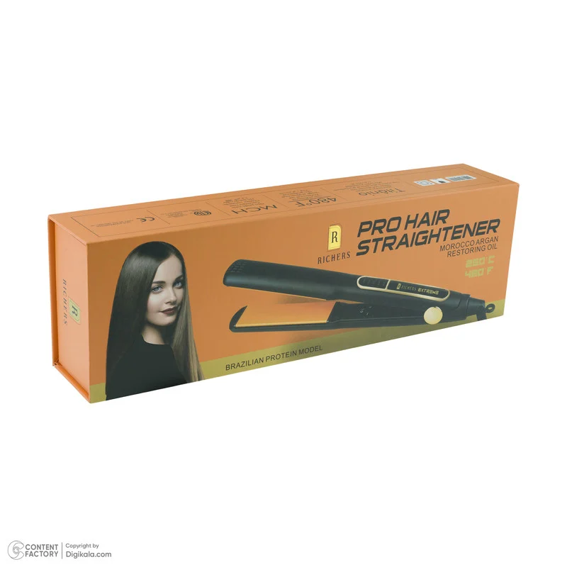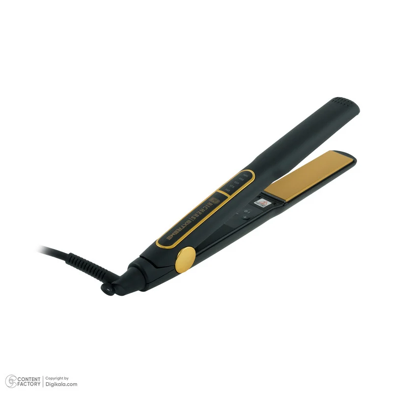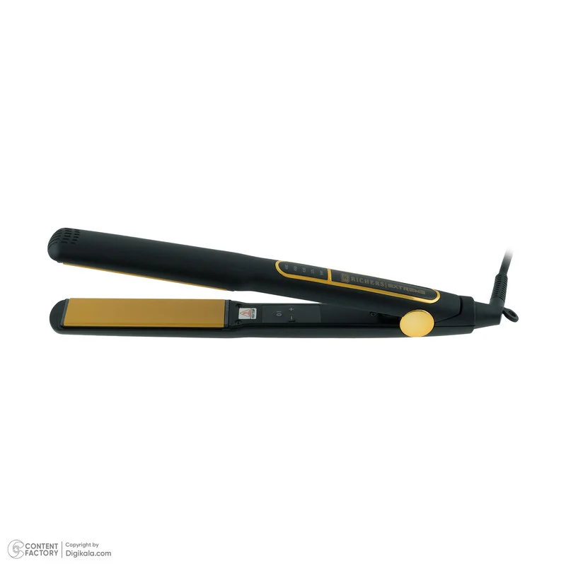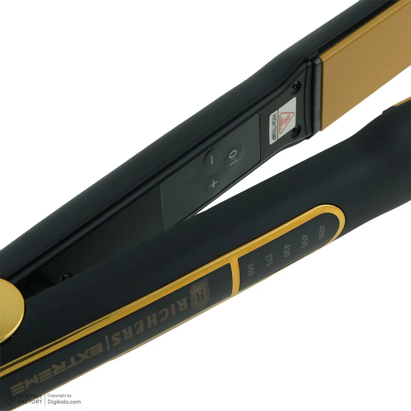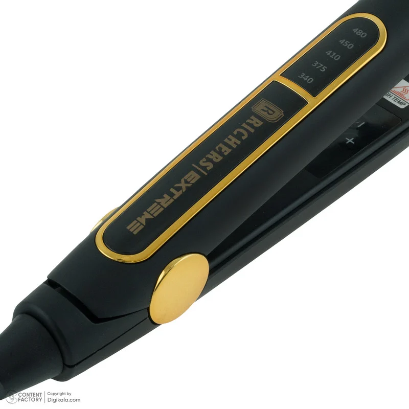 اتو مو ریچرز مدل extreme پرچمدار اتو موهای این برند انگلیسی است که با توجه به کارگیری از صفحات سرامیک تیتانیومی بدون اسیب رساندن به مو ها میتواند از داشتن موهای صاف و نرم لذت ببرید. از ویژگی های این اتو مو میتوان به داشتن 5تنظیم حرارت برای انواع موها حتی موهای رنگ شده استفاده کرد. دارای صفحات شناور بری جلوگیری از کشیدگی مو هنگام اتو کشی، طراحی لبه اتو مو مناسب انجام فر های منظم و راحت ، سیم گران برای راحتی دست هنگام استفاده، طراحی آیرودینامیک برای جلوگیری از خستگی در استفاده های طولانی مدت، وزن سبک دستگاه مناسب خانوم ها ، استفاده از المنت سرامیکی برای استفاده طولانی مدت و بدون افت دما و کابل بلند 2/5 متری، همه این ویژگی ها حس عالی بودن را به شما میدهد .