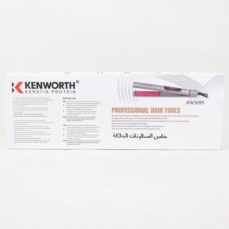 اتو مو حرفهای KENWORTH مدل KW3099 با بهرهگیری از تکنولوژی کراتین پروتئین، گزینهای ایدهآل برای افرادی است که به سلامت، لطافت و درخشندگی موهای خود اهمیت میدهند. این دستگاه با داشتن صفحات شناور 110 میلیمتری فشار یکنواختی را هنگام صاف کردن مو وارد میکند و از آسیب به بافت مو جلوگیری مینماید. قابلیت تنظیم دمای دیجیتال از 480 تا 980 درجه فارنهایت به شما این امکان را میدهد که بسته به نوع و جنس موی خود، بهترین درجه حرارت را انتخاب کنید. ویژگی گرم شدن سریع در مدت 30 ثانیه، موجب صرفهجویی در زمان شده و عملکرد سریعتری را برای استفاده شخصی یا حرفهای در سالنهای آرایشی فراهم میسازد. از دیگر مزایای این اتو مو میتوان به سیستم خاموشی خودکار پس از 60 دقیقه برای افزایش ایمنی، کابل چرخان 2 متری مناسب برای استفاده در فضای کاری و 6 سطح تنظیم حرارت اشاره کرد. اگر به دنبال یک اتو موی قدرتمند، بادوام و کاربردی برای استفاده حرفهای یا خانگی هستید، اتو مو KENWORTH مدل KW3099 با طراحی مدرن و عملکرد فوقالعاده خود انتخابی مطمئن خواهد بود.
