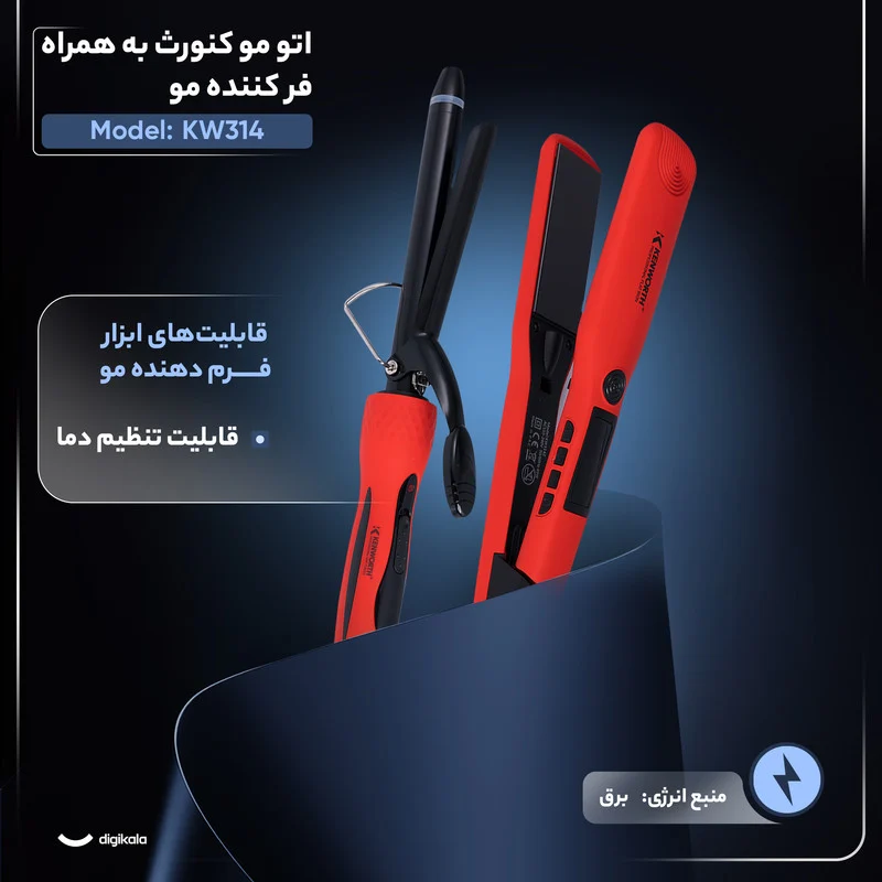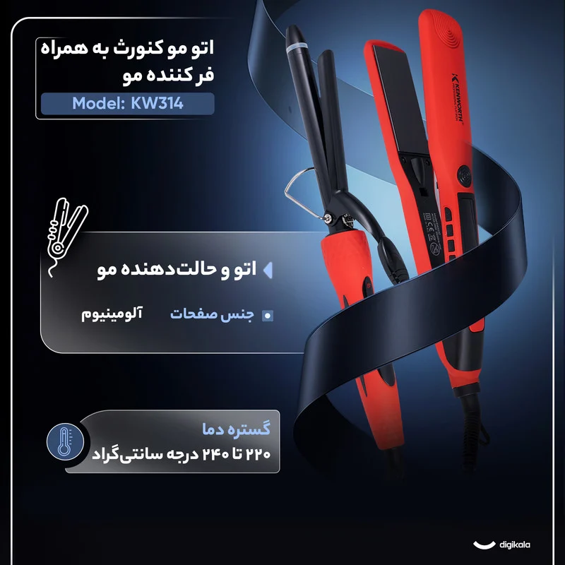 اتو مو کنورث مدل KW314 همراه با فر کننده، دستگاهی چندکاره است که امکان صاف و فر کردن مو را بهطور همزمان و با دقت بالا فراهم میکند. صفحات آلومینیومی با لبه تخت حرارت یکنواخت و سریع را منتقل میکنند و کاربر میتواند دما را بین ۱۲۰ تا ۲۳۰ درجه سانتیگراد تنظیم کند تا نتیجه دلخواه به دست آید. زمان گرم شدن تنها ۳۰ ثانیه است و نشانگر LED وضعیت دستگاه را نمایش میدهد تا استفاده آسان و بدون دغدغه باشد. خاموشی خودکار پس از ۶۰ دقیقه ایمنی و صرفهجویی در مصرف انرژی را تضمین میکند، در حالی که قفل صفحات و حلقه آویختن نگهداری و جابجایی دستگاه را ساده میکند. طول سیم دو متر، طراحی ارگونومیک و وزن مناسب، استفاده طولانی بدون خستگی را امکانپذیر میسازد. با سیستم گرمایش سریع و قابلیت فرمدهی مو، KW314 گزینهای مناسب برای استفاده خانگی و حرفهای است که موهایی صاف، درخشان و خوش حالت ایجاد میکند.