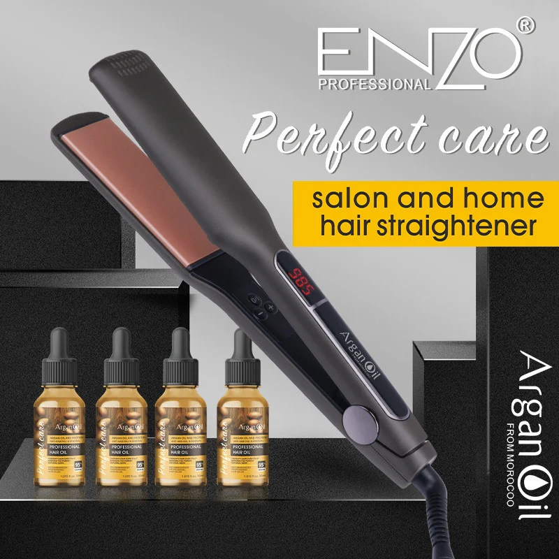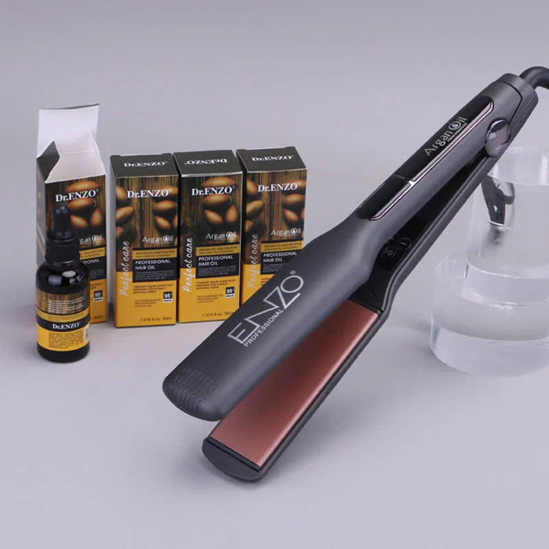 اتو مو حرفه ای انزو مدل EN-3984 همراه با 4 عدد سرم روغن آرگان مراکشی شرکت انزو پروفشنال اتو موی مدل EN-3984 را برای کار حرفه ای و با تکنولوژی روز دنیا تولید کرده است. اتو مو حرفه ای انزو مدل EN-3984 مخصوص کار حرفه ای کراتین و پروتئین در سالن می باشد و دارای صفحاتی از جنس سرامیک و تورمالین هست. صفحات پهن اتو موی انزو مدل EN-3984 برای حالت دادن به موهای بلند و ضخیم بسیار مناسب هست، چون حجم بیشتری از مو را درگیر می کند. صفحات این دستگاه کاملا رفلکس و متحرک هستند تا هم حجم بیشتری از مو را اتو کند و هم از خراشیده شدن و فشار اضافی به ساختار مو جلوگیری شود. اتو موی انزو پروفشنال مدل EN-3984 دارای تکنولوژی آیونیک (فناوری تولید یون) هست که هم الکتریسیته ساکن مو را خنثی می کند و هم ضخیم ترین موها را لخت می کند. اتو مو انزو 3984 قابلیت تنظیم دما در 8 دمای مختلف از 300 تا 985 درجه فارنهایت توسط دکمه ی + و – را دارد که از طریق نمایشگر LCD قابل نمایش می باشد. قدرت اتو موی انزو 50 وات هست که خیلی سریع صفحات را به صورت کاملا یکسان داغ می کند و آماده کار می شود. سیم اتو مو از نوع کابلی هست و 360 درجه هم قابل چرخش هست تا از پیچ خوردن در حین کار آسیب نبیند. همراه با پک این دستگاه 4 عدد سرم روغن آرگان مراکشی وجود دارد که برای جوانسازی و کاهش ریزش مو و بازیابی عمیق مو ها عمل میکند تا مو ها را نرم و ابریشمی کند ویژگی های روغن مو Enzo حاوی روغن آرگان نرم کننده و براق کننده مو: این روغن مو با فرمولاسیون منحصر به فرد خود، به عمق مو نفوذ کرده و ساختار آسیبدیده مو را ترمیم و تقویت میکند. استفاده منظم از این محصول باعث میشود که موها قویتر، سالمتر و انعطافپذیرتر شوند. محافظ مو در برابر حرارت: ترکیبات مرطوبکننده این روغن، مانند ویتامین E و گلیسیرین، به حفظ رطوبت طبیعی مو کمک میکنند و از خشکی و شکنندگی آنها جلوگیری میکنند.