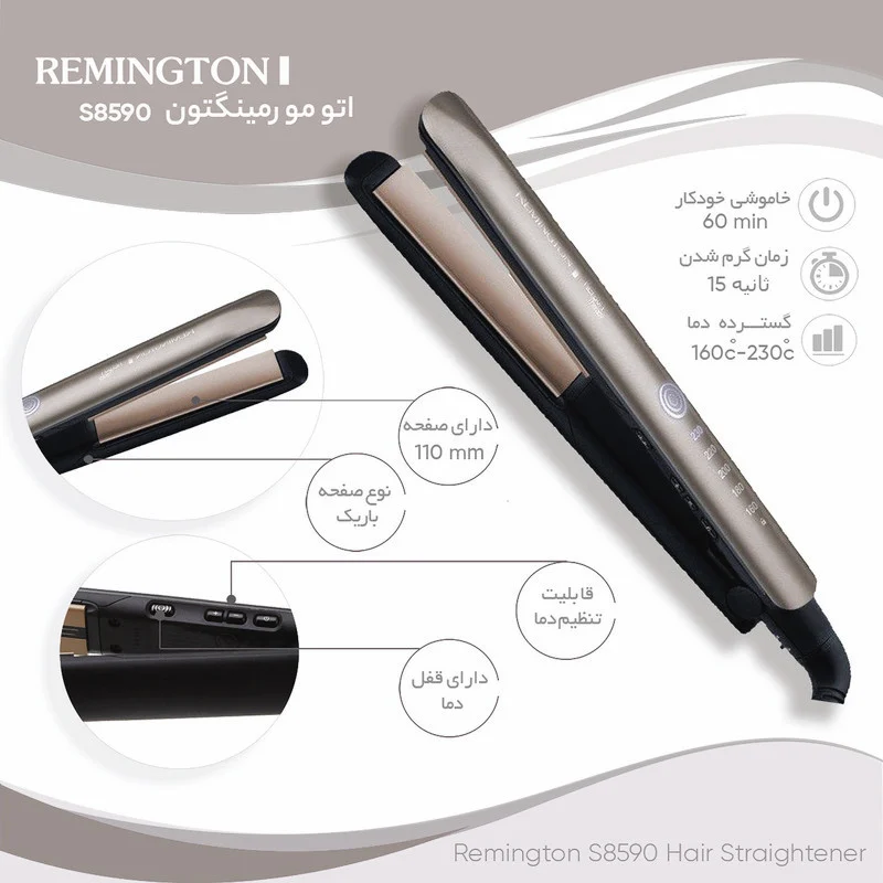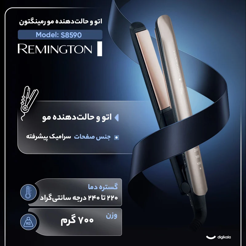 اتو و حالتدهنده مو رمینگتون مدل S8590، دستگاهی حرفهای با طراحی کاربرپسند است که علاوه بر صاف کردن مو، امکان کراتینکنندگی را نیز با صفحات سرامیک پیشرفته فراهم میکند. این محصول با ابعاد ۳۵۰ × ۱۲۷ × ۷۰ میلیمتر و وزن ۷۰۰ گرم، استفاده طولانی و راحت را ممکن میسازد. صفحات شناور ۱۱۰ میلیمتری، توزیع یکنواخت فشار روی موها را تضمین کرده و نتیجهای صاف و درخشان ارائه میدهند.