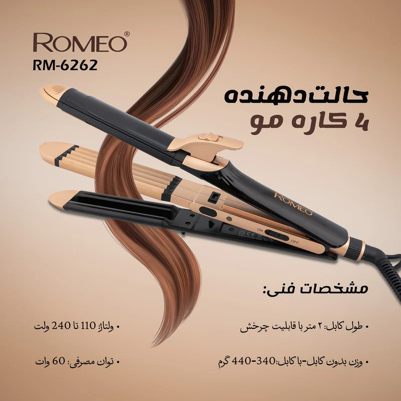برند ROMEO با تمرکز بر نوآوری، کیفیت و زیبایی، همواره در تلاش است تا ابزارهای حرفهای و در عین حال کاربرپسند را برای بازار جهانی تولید کند. مدل RM-6262 نیز نمونهای درخشان از همین رویکرد است. طراحی ظاهری مدرن و شیک، بستهبندی مناسب و عملکرد چندمنظوره باعث شده تا این محصول نه تنها برای استفاده شخصی و حرفهای بلکه بهعنوان یک هدیه شیک و کاربردی نیز گزینهای عالی باشد. همچنین با توجه به ولتاژ جهانی، این دستگاه همراهی مناسب در سفرها به شمار میرود. اگر به دنبال یک ابزار حرفهای، قدرتمند، خوشدست و زیبا برای حالتدهی به موهای خود هستید، فرکننده چهارکاره رومئو مدل RM-6262 انتخابی بینقص است.