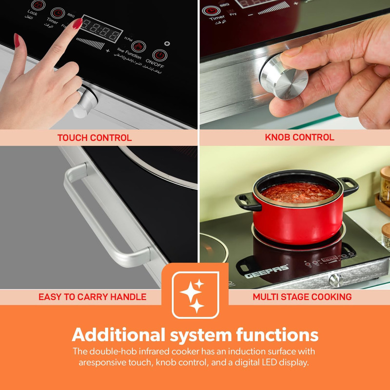 2 شعلهی اجاق گاز و کنترل دمای متغیر این اجاق گاز دوقلوی 2000 وات و 1200 وات به شما اجازه میدهد با شماره گیری دمای متغیر جداگانه 9 تنظیم حرارت گوناگون را انتخاب کنید و غذا را در دمای عالی بپزید.