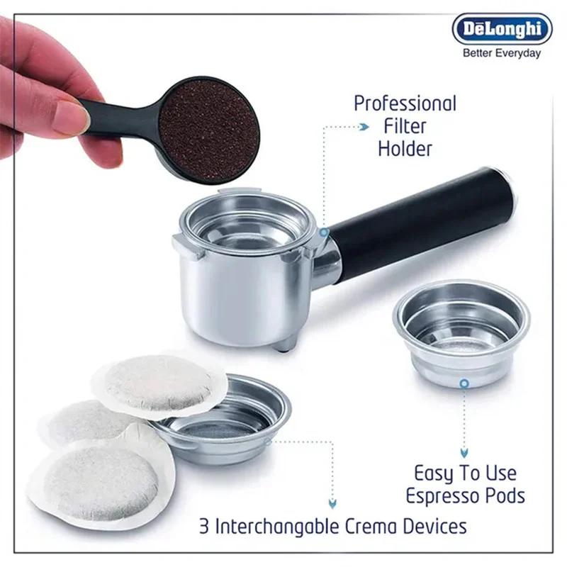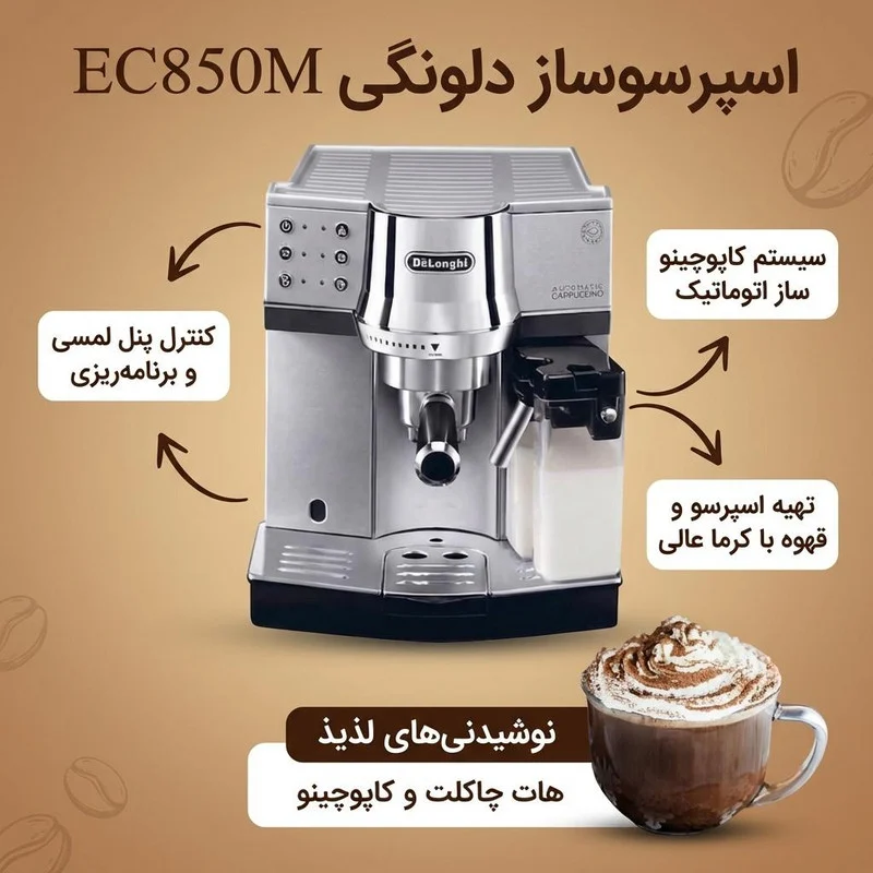 اسپرسو ساز دلونگی مدل EC850M با قدرت 1450 وات و فشار 15 بار، توانایی استخراج قهوه ای با کیفیت بالا را دارد. همچنین، این دستگاه دارای صفحه نمایش LCD و کاربری آسان است. با کنترل دما، شما می‌توانید دمای اسپرسو را به دلخواه خود تنظیم کنید و اسپرسویی با طعم مطلوب بسازید.