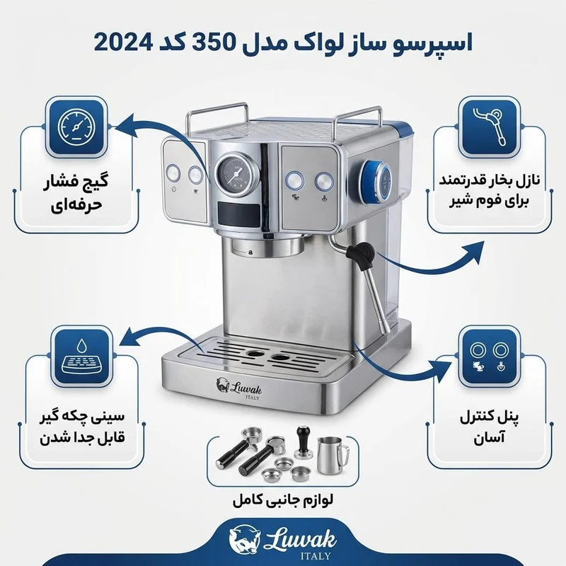- امکانات اسپرسوساز: سیستم گرم کردن فنجان، سینی چکه گیر، نازل بخار، نمایشگر دیجیتال