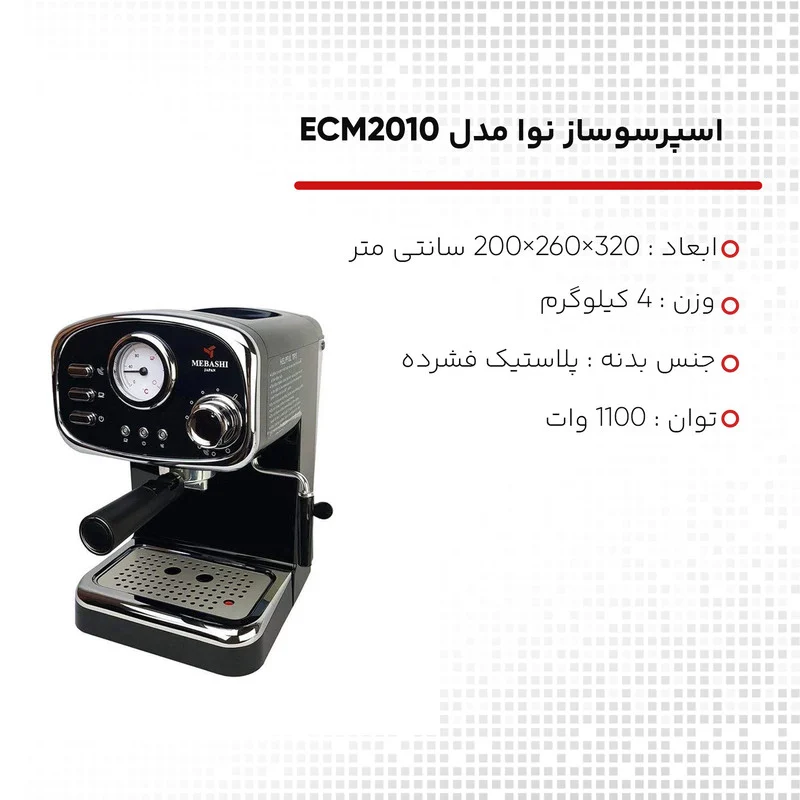 شرکت مباشی متخصص تولید انواع دستگاه های اسپرسوساز خانگی محصول جدید، قدرتمند و زیبای خود را به نام اسپرسوساز مباشی مدل ECM2010 در رنگبندی های مشکی ، شیری و قرمز به بازار عرضه کرده است. از جمله ویژگیهای این محصول داشتن موتور با فشار 20 بار و ظرفیت 1100 وات قدرتمند ایتالیایی میباشد که باعث شده قهوه خروجی دارای کرمای با غلظت عالی باشد. و همچنین دارای بخار خروجی فوق العاده قوی میباشد اسپرسوسازمباشی مدل ECM2010 مجهز به پیچ تنظیم بخار میباشد که امکان تهیه فوم شیر با غلظت های متفاوت را با تنظیم بخار خروجی فراهم می آورد.از جمله ویژگیهای این دستگاه داشتن نشانگر عقربه ای دما میباشد که هم به دستگاه زیبایی خاصی داده و هم اینکه کاربر راحت تر میتواند با دستگاه کار کند اسپرسوساز مباشی مدل ECM2010 مجهز به صفحه گرم نگهداره فنجان است که به شما کمک میکند تعداد بیشتری فنجان قهوه را پیش گرم کنید و از نوشیدن یک فنجان اسپرسو خوب لذت ببرید. دستگاه اسپرسوساز مباشی مدل ECM2010 دارای دو فیلتر تک اسکوپ و دو اسکوپ میباشد و پرتا فیلتر آن به نحوی طراحی و ساخته شده است که با عصاره گیری کامل، قهوه اسپرسوی پرخامه و غلیظی را به شما تحویل میدهد. دستگاه اسپرسو ساز مباشی مدل ECM2010 مناسب برای مصارف خانگی ، محل کار ، سوپرمارکت ها، کافی شاپ های کوچک و مکانهای مشابه است.جهت داشتن قهوه اسپرسوی معطر و خالص حتما از آب تصفیه شده که فاقد املاح اضافی میباشد استفاده نمایید زیرا به مرور زمان املاح منافذ دستگاه را گرفته و در کیفیت قهوه و بخار خروجی تاثیر بسزایی دارد. جهت امنیت بالا دستگاه مجهز به سیستم قطع خودکار میباشد که در صورت عدم کار با دستگهاه بعد از 29 دقیقه دستگاه خودبخود خاموش میشود.اقلام همراه این دستگاه فیلتر تک اسکوپ و دو اسکوپ، تمپر، دسته هد گروپ و دفترچه راهنما میباشد.جهت داشتن قهوه اسپرسوی پرخامه و با کیفیت حتما از قهوه با آسیاب متوسط استفاده کنید.