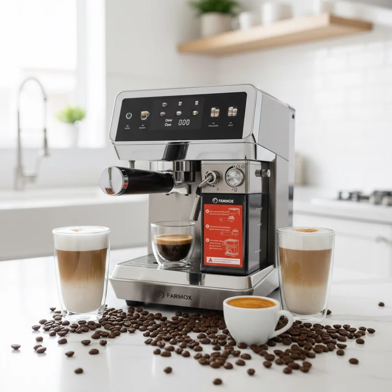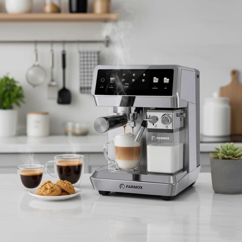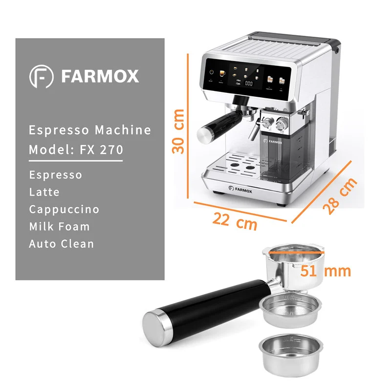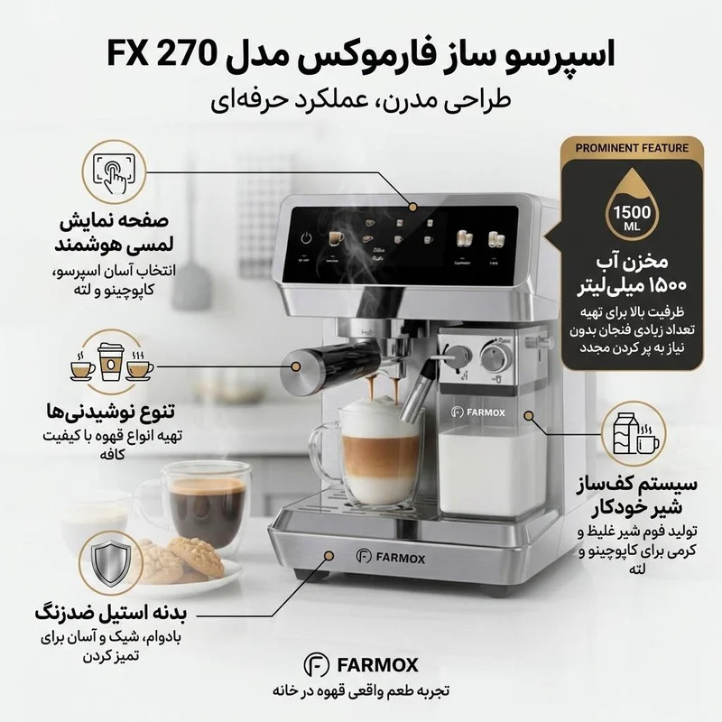 اسپرسوساز FX270 فارموکس با بدنه تمام استیل و مخزن آب و مخزن شیر پلاستیکی باکیفیت ساخته شده است.
