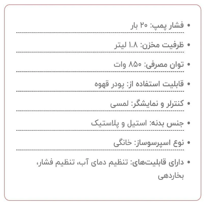 (TOUCH PANEL) می باشد که با توجه به ویژگی های فنی و نیز ابعاد مناسب، یکی از بهترین انتخاب ها برای مصارف خانگی است. جنس بدنه دستگاه ترکیبی از استیل و پلاستیک مقاوم بوده که در کنار ابعاد مناسب ترکیبی چشم نواز و مدرن درهر فضایی ایجاد می نماید . مخزن آب دستگاه 1.8 لیتر و از جنس با کیفیت و شفاف AS می باشد . لازم به ذکر است این دستگاه با فشار پمپ 20 بار و توان 850 وات قابلیت ساختن انواع اسپرسو ، لاته ،کاپوچینو،آمریکانو و سایر نوشیدنی ها با پایه قهوه را داراست.