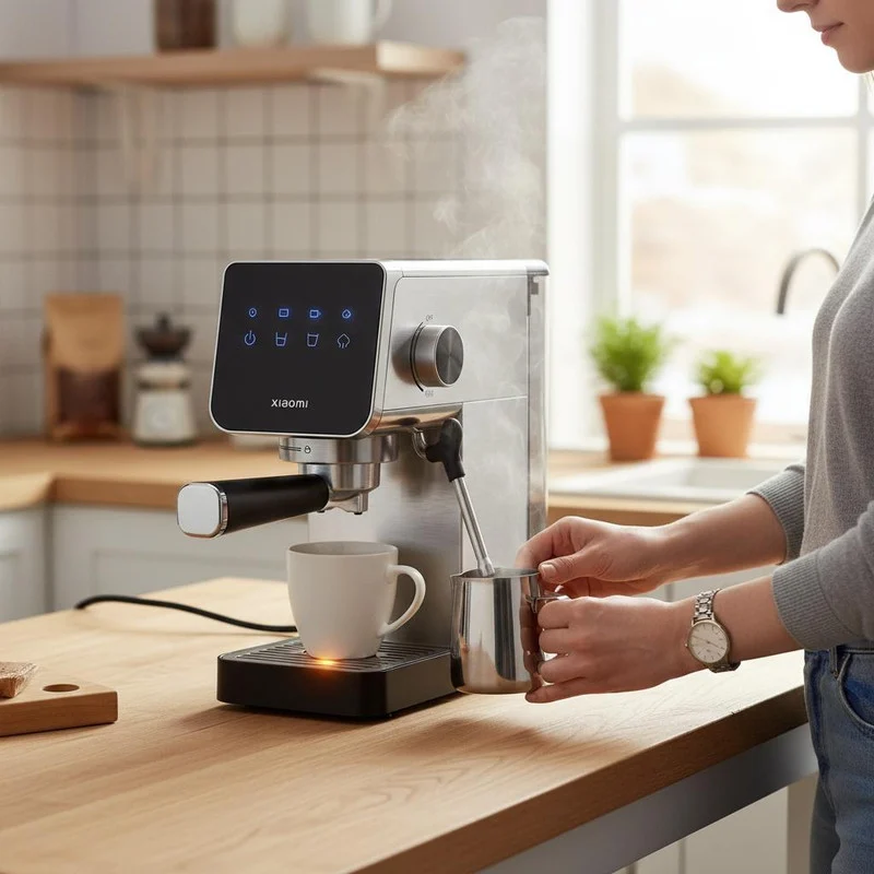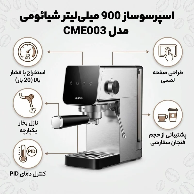 دستگاه اسپرسو ساز نیمه اتوماتیک شیائومی مدل CME003-EU با طراحی فلزی جمع و جور (عرض ۱۴ سانتیمتر) و وزن ۳٫۵ کیلوگرم، از فشار پمپ ۲۰ باری برای استخراج حرفهای قهوه، سیستم پیشتیمار پیشرفته، صفحه لمسی برای تنظیم حجم اسپرسو (۴۰ یا ۸۰ میلیلیتر) و پانارلو دستی برای کف کردن شیر استفاده میکند. این دستگاه با مصرف انرژی ۱۳۵۰ وات، مخزن آب ۰٫۹ لیتری جداشدنی و سنسور NTC برای تنظیم دما، گزینهای ایدهآل برای تهیه اسپرسوی باکیفیت در خانه یا محل کار است