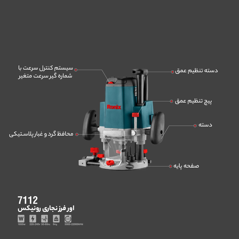 • سایر توضیحات: موتور قدرتمند 1850 وات برای بهترین عملکرد در طیف گسترده‌ای از کاربری‌های نجاری – ابزاری کارآمد با حداکثر سرعت 22000 دور در دقیقه به منظور ایجاد برش های سریع و تمیز حتی بر روی چوب های سخت – دارای سرعت متغیر از 5000 تا 22000 دور در دقیقه – مجهز به مکانیزم دقیق تنظیم عمق برش که سبب افزایش سرعت و دقت در انجام عملیات کاری میشود – قابلیت تنظیم ارتفاع در 3 سطح متفاوت برای داشتن نهایت دقت در کار برای کاربری های مختلف – دارای سه نوع ظرفیت کولت (6 میلی متر، 8 میلی متر، 12 میلی متر) – دوام و دقت بالای بدنه به علت ساختار آلومینیومی – قابلیت Soft-Start برای شروعی آرام و ایمن – کفی ساخته شده از آلیاژ آلومینیوم به همراه فنرهای با دوام فولادی در طرفین دستگاه به منظور سهولت در عملکرد و تنظیم عمق – مجهز به دستگیره های نرم لاستیکی برای راحتی بیشتر – دارای صفحه پلاستیکی متحرک برای محافظت از کفی وکمک به حرکت راحت تر دستگاه بر روی قطعه کار – سیستم قفل‌‌کن ساده و کارآمد برای کفی – مناسب برای طیف گسترده ای از کارها از جمله ایجاد شیار، ایجاد سوراخ و برش، زه‌وار، شکل دادن به لبه، تراش قطعات و … – دارای سیستم قفل شفت برای تعویض آسان و ایمن تیغه الماسه – محافظ پلاستیکی گرد و غبار برای جلوگیری از پرتاب تراشه ها و پخش گرد و غبار