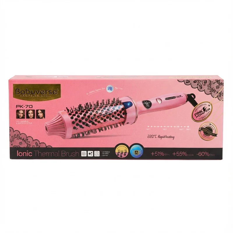 برس حرارتی یونی Babuyverse مدل PK-70 سری Pink Power یک ابزار کاربردی برای حالتدهی سریع و آسان مو در استفاده روزمره است. این برس با ترکیب حرارت و طراحی برس، به شما کمک میکند بدون نیاز به سشوار یا اتو مو، موهایی صاف، خوشحالت و مرتب داشته باشید.