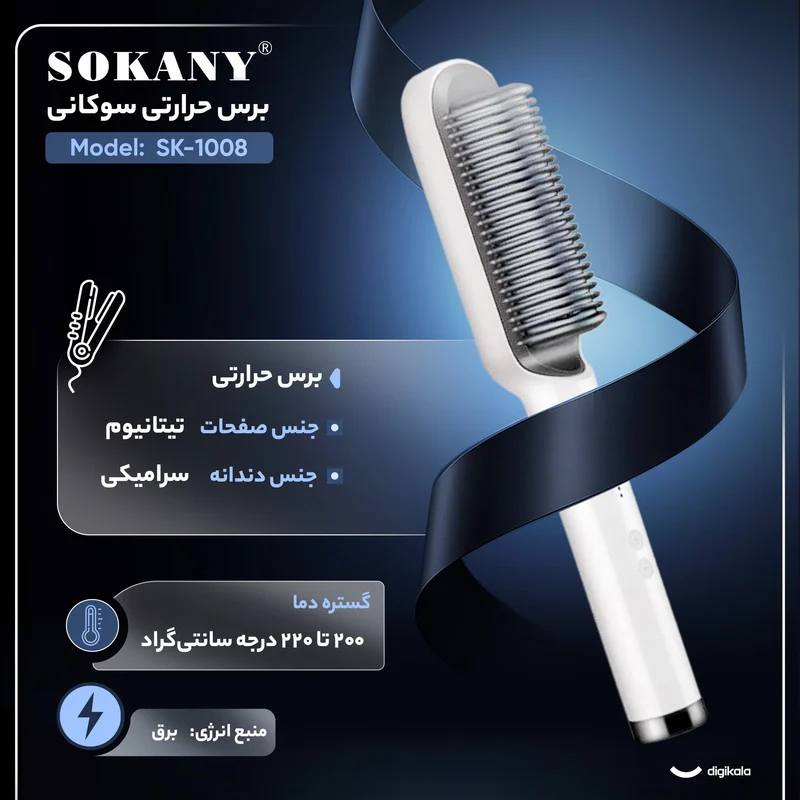 این برس سوکانی اصلی ، موها را به راحتی لخت و شلاقی میکند.حداکثر دما و حرارت این برس بین 710-950 درجه فارنهایت (130-200 درجه سانتی گراد) می باشد.استفاده از این برس کاملا راحت و آسان است و وزی و موخوره شما را کاملا برطرف می سازد.جنس صفحات این برس تیتانیوم است و دارای دکمه ایی برای تنظیم حرارت می باشد .این برس به راحتی و حتی بهتر از اتو مو موهای شما را بسیار صاف و ابریشمی کرده و کمترین آسیب را به موها می رساند .این دستگاه برای آقایان نیز قابل استفاده است و از آن می توان حتی برای صاف کردن ریش استفاده کرد.منبع تغذیه این برس از برق شهری می باشد.