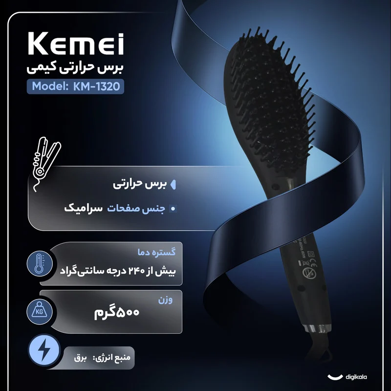 برس حرارتی کیمی مدل Km-1320 گرمایش سریع دارد و یکی از صاف کننده های مو به شمار می رود.این برس حرارتی پوشش سرامیکی دارد و دمای آن از 300 درجه فارنهایت تا 750 درجه فارنهایت می باشد.سیم چرخشی 360 درجه و نمایشگر LED و دکمه روشن و خاموش و قابلیت تنظیم دما را هم دارد.