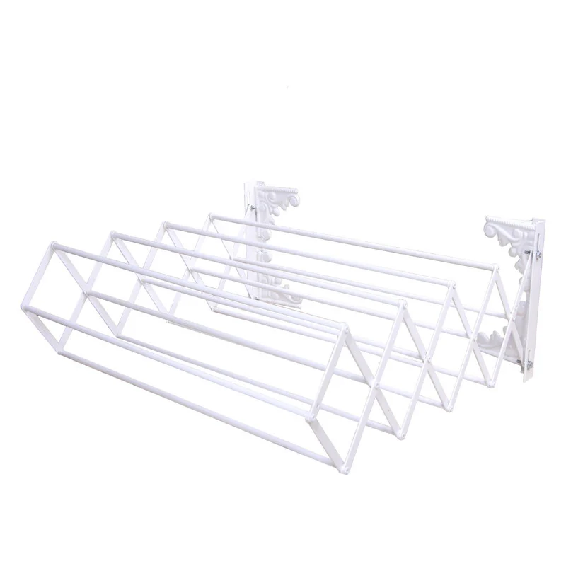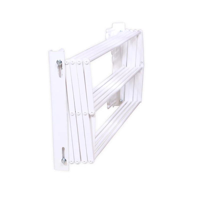 13 ردیف پهن نمودن لباس -هرردیف 60 از جنس اهن محکم وپوشش رنگ الکترو استاتیک که در کوره حرارت می بیند و مقاومت بالا دارد نوع سفید یخچالی – 13×60=حدودا 7مترو نیم طول جهت پهن نمودن لباس در کوچکترین تراس -دو نگهدارننده در کنار که حالت جمع شو رخت اویز را نگهداری می کند – ابعاد که به دیوار نصب شده 62×30و جمع شو 10 سانتیمتر – کلیه اتصالات توسط پیچ و مهره می باشد و نقاط ثابت با جوش کاری CO2 – حاشیه و کادر رخت اویز با 4 عدد لچکی می باشد