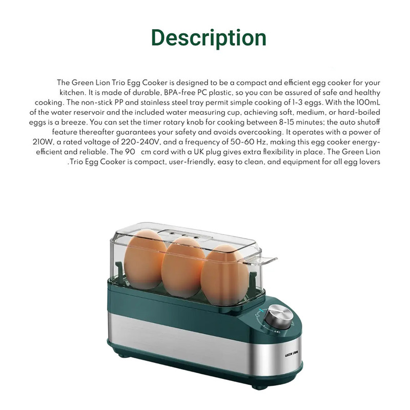کمپانی گرین لاین از تولید کنندگان به نام در زمینه ی تولید لوازم شخصی و لوازم جانبی دیجیتال می باشد که همواره با توجه به نیاز روز جامعه بهترین و کاربردی ترین محصولات را تولید و روانه بازار می نماید. این کمپانی با طراحی ساده در عین حال کاربردی خود توانسته است نظر کاربران زیادی را به خود جلب کرده و با برند های مطرح و درجه یک به رقابت برخیزد. یکی از به روز ترین تولیدات این برند، تخم مرغ پز مدل TRIO EGG COOKER می باشد که به تازگی به بازار عرضه شده است.