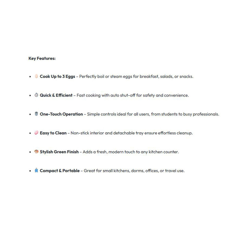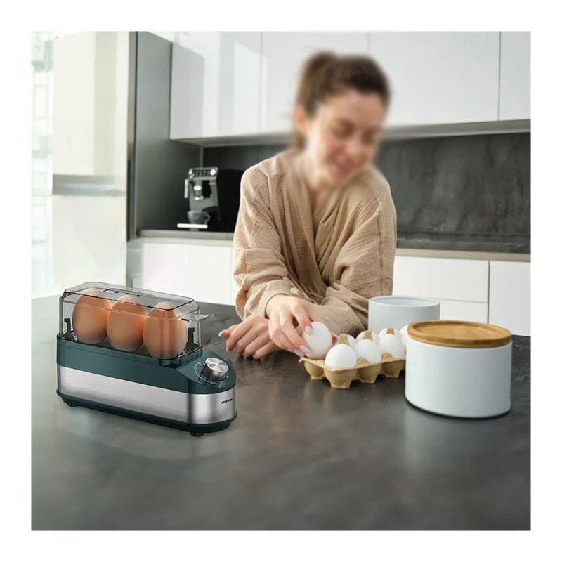 تخم مرغ پز گرین لاین مدل GL-EC22 دارای دکمه چرخشی تایمر است که می توانید با توجه به نیاز و سلیقه ی خود (نرم، متوسط یا سفت آب پز)، بین ۸-۱۵ دقیقه دستگاه را تنظیم نمایید (در بسته بندی این محصول یک پیمانه اندازه گیری آب و دفترچه راهنما نیز برای استفاده راحت تر کاربران قرار داده شده است.) مخزن آب تعبیه شده برای تخم مرغ پز GREEN LION گرین لاین نیز ۱۰۰ میلی لیتر ظرفیت دارد. همچنین فضای داخلی نچسب و سینی جدا شدنی به کار رفته در طراحی این محصول تمیز کردن فضای داخلی را برای کاربر آسان تر نموده است.