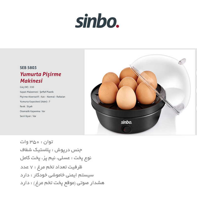 سینبو ؛ در مورد کالاهای خانگی یک برند جهانی است که با 30 سال سابقه صنعت به بیش از 70 کشور جهان صادرات دارد و ماموریت ایجاد مدرن ترین محصولات را دارد. ساخت ترکیه با کیفیت بالا ، دستگاه پخت و پز تخم مرغ Sinbo New Seb-5803 برای کسانی طراحی شده است که تخم مرغ را در میز صبحانه خود رها نمی کنند، به شما این امکان را می دهد که تخم مرغ ها را به قوام و پخت مورد نظر به روشی کارآمد بجوشانید. این محصول با ظرفیت پخت تا 7 تخم مرغ به شما کمک می کند تا به راحتی تخم مرغ را برای همه، حتی در میزهای شلوغ صبحانه خود تهیه کنید. طراحی شیک و کاربردی در یک محصول گرد هم آمده اند، دستگاه پخت و پز تخم مرغ سینبو که با طراحی ارگونومیک خود این ویژگی را دارد که فضای زیادی را در آشپزخانه شما اشغال نمی کند با طراحی شیک خود ظاهر زیبایی را بر روی پیشخوان شما ارائه می دهد. این دستگاه که به لطف صفحه گرمایش از جنس استیل ضدزنگ می‌تواند سال‌ها به شما خدمت کند، با طراحی درب شفاف خود به شما اجازه می‌دهد تا هنگام جوشیدن بدون برداشتن درب، تخم‌ها را کنترل کنید. دستگاهی که در آن می توانید تخم مرغ ها را متناسب با هر سلیقه ای بجوشانید، با ظرف آب خود که به شما امکان تنظیم سطح پخت تخم مرغ ها را می دهد، زمانی که تخم مرغ ها با صدا و نور به قوام دلخواه رسیدند، به طور خودکار خاموش می شود و برای شما هشدار صوتی ارسال می کند. چند دلیل خوب برای انتخاب دستگاه پخت تخم مرغ سینبو : این دستگاه که دارای عملکرد خاموش شدن خودکار است، زمانی که تخم مرغ شما به قوام و پخت مورد نظر برسد و سیستم هشدار صوتی فعال شود، خاموش می شود. با محفظه بزرگ پخت 7 عدد تخم مرغ، به شما کمک می کند تا تخم مرغ را حتی برای میزهای شلوغ بپزید.با توجه به اینکه محفظه پخت از استیل ضد زنگ می باشد استفاده طولانی مدت را ارائه می دهد، پوشش شفاف رویی به شما امکان می دهد تخم مرغ های خود را هنگام جوشیدن کنترل کنید. به لطف مخزن آب اندازه گیری شده، به شما این امکان را می دهد تا سختی تخم مرغ های خود را به دلخواه تنظیم کنید.