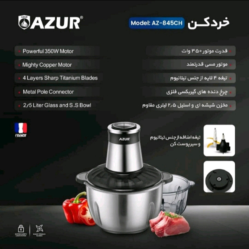 خردکن آزور مدل AZ-845CH دارای موتور قدرتمند مسی با توان ۳۵۰ وات که به وسیله گیربکس کاملا فلزی به تیغه های تیتانیوم بسیار تیز متصل است این خرد کن از ظرف پیرکس و استیل ۳ لیتری برخوردار است