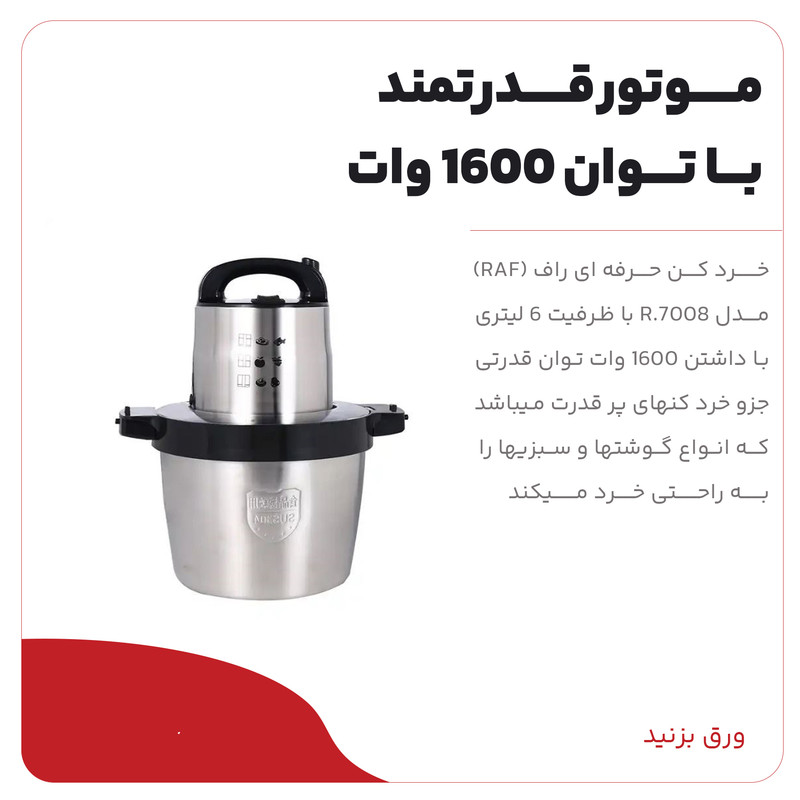| سایر توضیحات | ولتاژ نامی/فرکانس: 220 ولت توان نامی: 1600 وات حجم: 6 لیتر جنس متریال: فولاد ضد زنگ دارای یک تیغه4پره ویک تیغه دوپره |