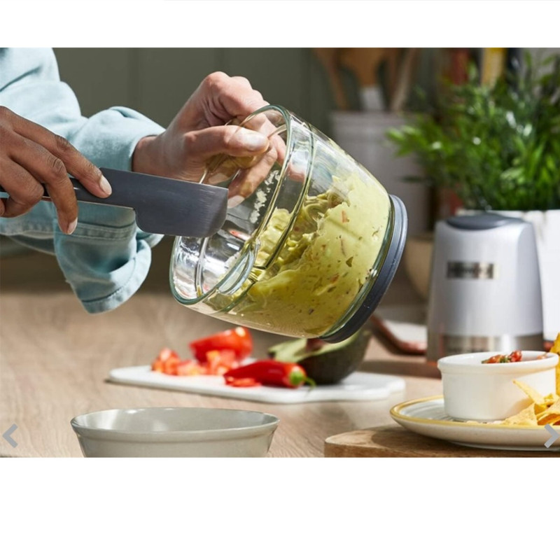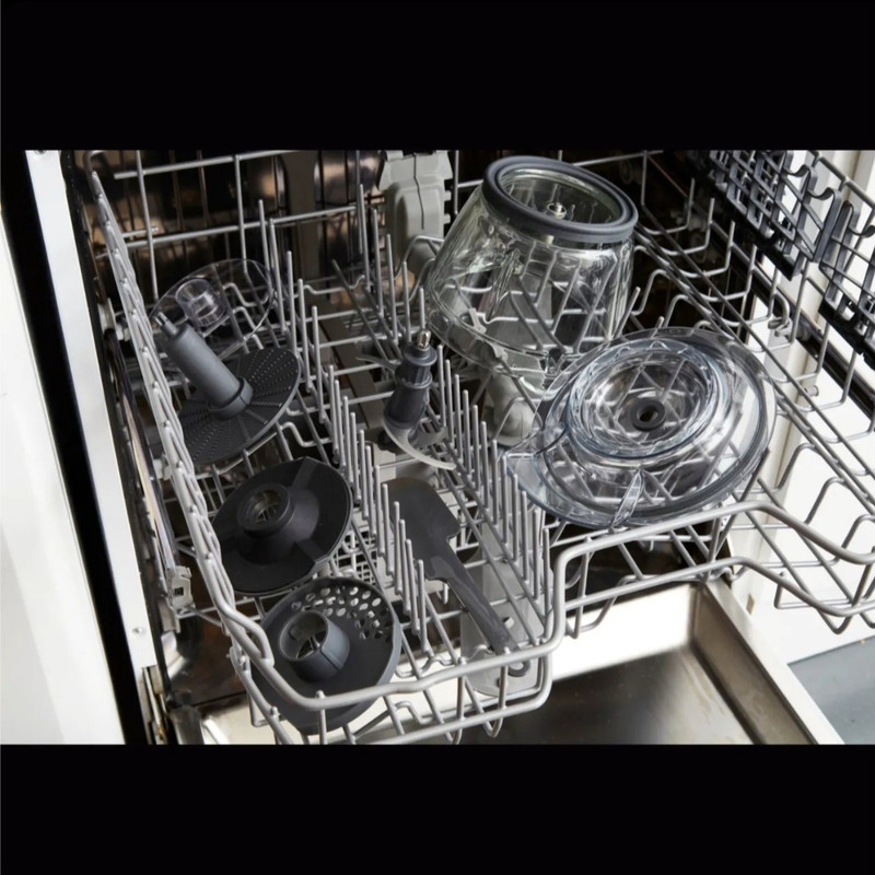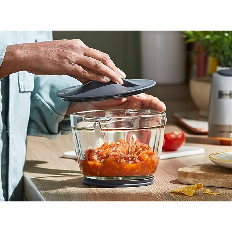 ظرف کار شیشه ای با کیفیت بالا با حجم کاری 0.6 لیتر نیز برای مقادیر بیشتر ایده آل است و به لطف اتصال Dripper Pro، همچنین اجازه می دهد تا مایعات در طول پردازش اضافه شود.کفی بدون لغزش برای ثابت نگه داشتن کاسه روی میز کار، حلقه کابل برای نگهداری منظم کاسه پس از استفاده و مینی باکس و سیستم ایمنی دارا می باشد.این خردکن را می توان از هم جدا کرد تا به راحتی تمیز شود. کاسه را می توان پس از تهیه سس های خوش طعم، سالاد و غیره در ماشین ظرفشویی قرار داد.