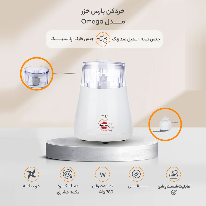 اگر تابه‌حال از خردکن‌ها برای آماده‌سازی مواد غذایی برای پخت غذاها استفاده نکرده‌اید پیشنهاد می‌کنیم هرچه سریع‌تر یکی از دستگاه‌های پرکاربرد را تهیه کنید. استفاده از خردکن‌ها نه‌تنها سخت نیست، بلکه سرعت آشپزی شمارا افزایش می‌دهد. از مزایای خردکن‌ها نسبت به غذاسازها می‌توان به کوچک بودن و سهولت در نظافت اشاره کرد. مدل امگا یکی از جدیدترین محصولات شرکت پارس خزر است که روی کاغذ به نظر می‌رسد محصولی فوق‌العاده قدرتمند باشد. توان این دستگاه 780 واتی است که رقمی فوق‌العاده مناسب ارزیابی می‌شود. همچنین شرکت پارس خزر عنوان کرده که با این دستگاه می‌توانید انواع مواد غذایی از سبزیجات و خشکبار گرفته تا گوشت را خرد نمایید.