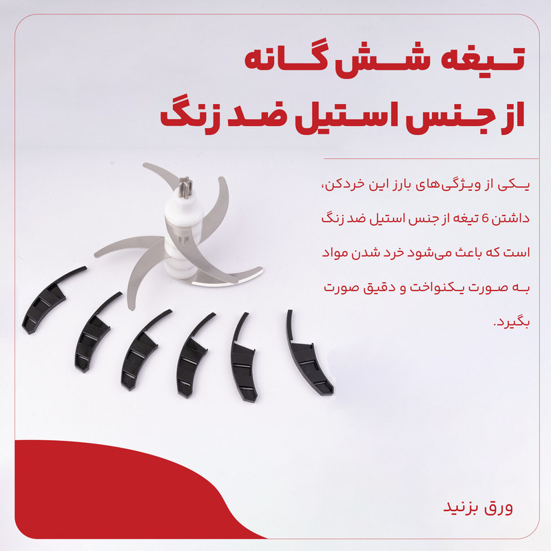 • قابلیت‌های عملکردی: خردکردن سبزیجات، خرد کردن یخ، خردکردن گوشت، مخلوط کردن مواد