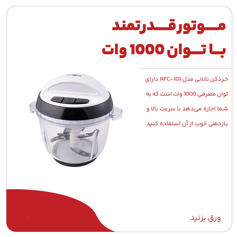 روزانه هنگام تهیه غذا، سالاد و انواع تنقلات لازم است که برخی از مواد را خرد نمایید، این کار با استفاده از چاقو بسیار خسته کننده است و زمان زیادی می برد. در صورت داشتن یک دستگاه خردکن برقی می توانید مقدار زیادی مواد غذایی را در مدت زمان کمی خرد نموده، بدون آنکه احساس خستگی کنید.خردکن نانانی مدل NFC-101 دارای توان مصرفی 1000 وات است که به شما اجازه می‌دهد با سرعت بالا و بازدهی خوب از آن استفاده کنید. حجم ظرف این خردکن 3 لیتر است که فضای کافی را برای قرار دادن مقدار زیادی از مواد غذایی فراهم می‌کند. همچنین، شما می‌توانید با انتخاب یکی از سه سرعت مختلف، نحوه خرد شدن مواد را به دلخواه خود تنظیم کنید. یکی از ویژگی‌های بارز این خردکن، داشتن 6 تیغه از جنس استیل ضد زنگ است که باعث می‌شود خرد شدن مواد به صورت یکنواخت و دقیق صورت بگیرد. خردکن نانانی مدل NFC-101 یک انتخاب مناسب برای استفاده روزمره شما می باشد.