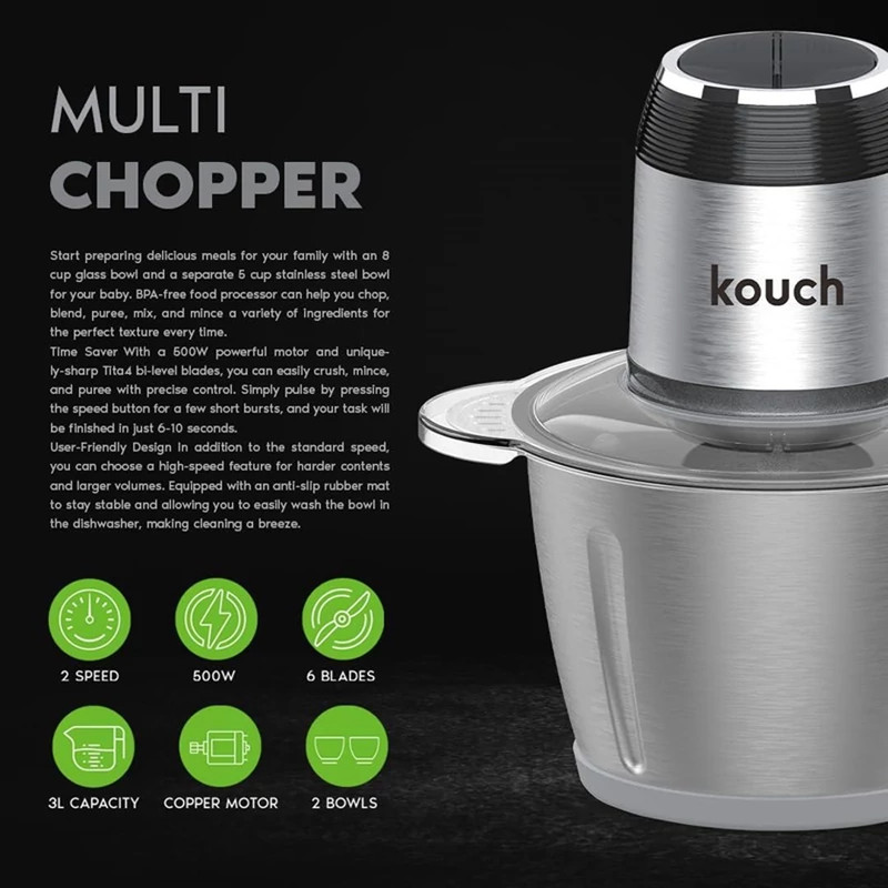 خردکن دو کاسه کوخ المان مدل KC-2044 یک وسیله آشپزخانه همه کاره و قدرتمند است که برای ساده کردن کارهای آماده سازی غذا طراحی شده است. Chopper مجهز به یک موتور مسی 500 واتی است و به راحتی وظایف خرد کردن گوشت، میوه ها و سالاد را انجام می دهد. چرخ دنده فلزی و اتصال دهنده بادوام عملکرد قابل اعتماد و استفاده طولانی مدت را تضمین می کند. این دستگاه دارای ظرفیت 3.0 لیتر است که به شما امکان می دهد مقادیر زیادی از مواد را به طور همزمان پردازش کنید. کنترل دو سرعته به شما امکان می دهد سرعت خرد کردن را بر اساس نیاز خود تنظیم کنید. از سرعت 1 برای مواد ظریف مانند تخم مرغ، سیر و سبزیجات و سرعت 2 برای مواد سفت تر مانند هویج، گوشت و زنجبیل استفاده کنید