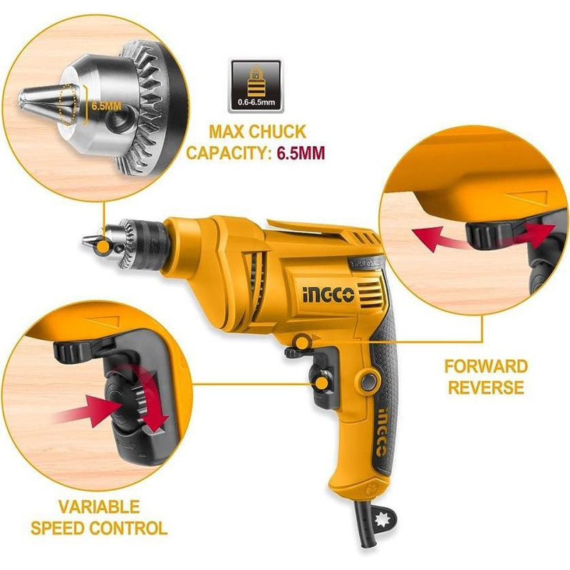 دریل 500 وات برقی اینکو مدل ED500282 یک دریل ساده با موتور قدرتمند است که قادر است سرعت گردش بی بار 0 تا 3300 دور در دقیقه را برای انجام کاربری های مختلف خانگی و صنعتی شما ایجاد کند. این دریل نارنجی رنگ و زیبا دارای دیمر کنترل سرعت به صورت پیچی است تا برای سوراخکاری انواع سطوح فلزی، چوبی، ام دی اف و سایر مواد مختلف در انواع مشاغل و مصارف نجاری، آهنگری، نصابی، تاسیسات و مونتاژ به خوبی به کار شما بیاید. شرکت سازنده در طراحی این دریل ویژگی بسیار کاربردی گردش به صورت چپ‌گرد و راست‌گرد را در نظر گرفته است که این تغییر جهت گردش دریل به کمک یک کلید به صورت زائده در زیر دسته انجام می پذیرد. این محصول ساخت کشور چین است.