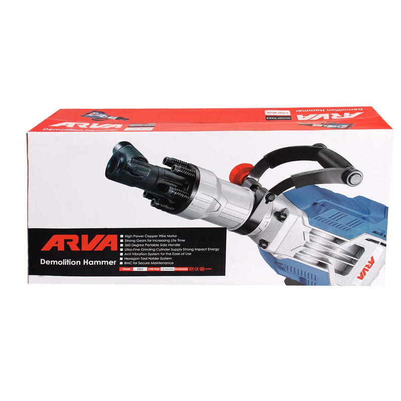 آروا بتن کن 16 کيليويي 1700 وات کد 5253 دارای بلبرینگ های ضد غبار دارای سیلندر صنعتی جهت تولید انرژی ضربه ای قوی تر سیم های ورودی دستگاه همگی مطابق استاندارد VDE دارای کلید های صنعتی ضد غبار از بهترین برندهای موجود در بازار تمام موتور های دستگاه ها دارای چسب محافظ در قسمت کالکتور دستگاه می باشند. دارای موتور نخ بندی شده جهت حفاظت از موتور در برابر ضربات احتمالی اجسام خارجی نفوذ کرده به موتور تمامی سیم های به کار رفته در سیم پیچی موتور همگی 100% مس و دارای تحمل حرارت تا 220 درجه می باشند. تمامی گیربکس ها و دنده ها از بهترین آلیاژ و سخت کاری شده مطابق با استاندارد روز دنیا جهت طول عمر بیشتر دستگاه دارای کیف BMC جهت سهولت حمل دستگاه دارای 2عدد ذغال یدکی و 1عدد آچار شش گوش (سیستم قلم گیر شش گوشه) و 2عدد آلن دارای 1عدد مخزن گریس دسته جانبی با قابلیت چرخش 360 درجه سیستم چرخشی منحصر به فرد دارای 1عدد قلم نوک تخت و 1عدد قلم نوک تیز همگی به سایز 410×30 میلی متر