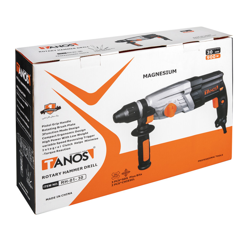 دریل بتنکن تانوس مدل RH_01_26 با قابلیت تنظیم در سه حالت سوراخکاری،سوراخکاری ضربهای و تخریب و توان 800 وات 26 میلیمتری طراحی و به بازار عرضه شده و برای ساخت سیلندر و پیستون آن بهترین آلیاژ بهکار رفته گرفته شده است.برای سهولت در استفاده از دریل، دسته TPR با قابلیت چرخش 360 درجه تعبیه شده و دارای کلید ضد گرد و غبار است. همچنین، این دریل بتنکن سه حالته چکشی مجهز به دکمه تغییر جهت مته میباشد. از اقلام همراه این محصول میتوان به 3 مته و دو عدد قلم چهارشیار SDS ، خطکش و دفترچه راهنما اشاره کرد.