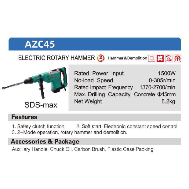دریل بتن کن مدل AZC45 از موتور قدرتمند 1500 وات صنعتی استفاده میکند که برای کاربران این امکان را فراهم کرده تا مته را با سرعتی در بازه 0 الی 305 دور بر دقیقه به قطعه کار وارد کنند. همچنین قابلیت نرخ ضربه بالا و قابل قبول 1370 تا 2700 ضربه بر دقیقه را دارا میباشد که امکان انجام انواع عملیات های سوراخ کاری سخت را فراهم میکند.