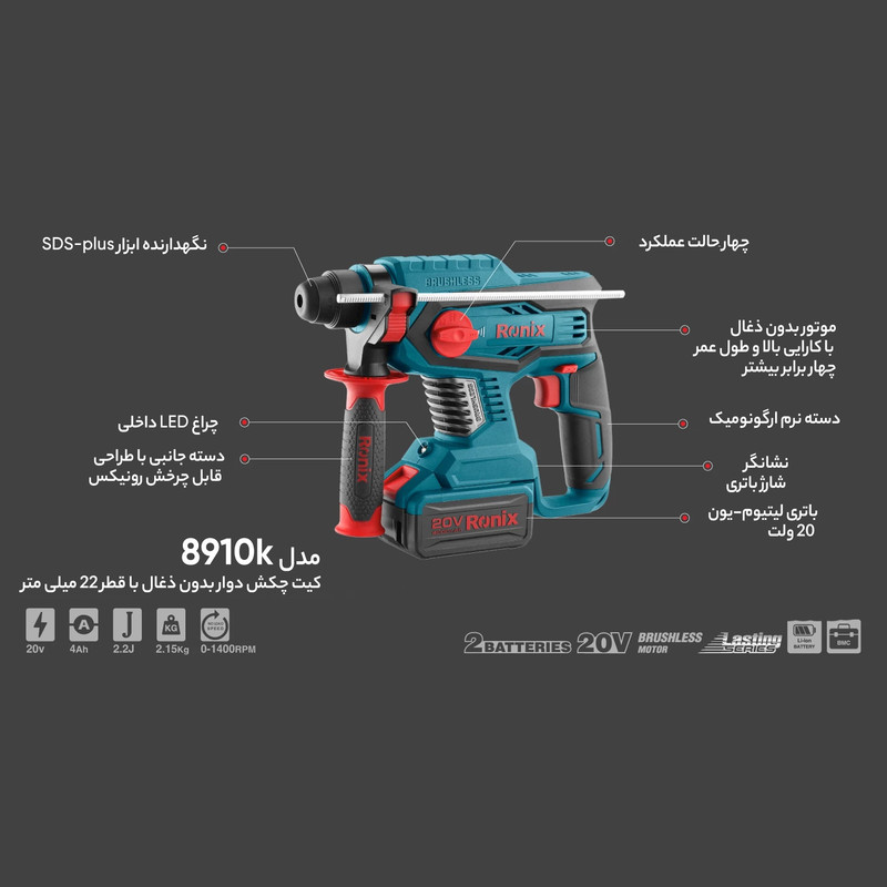 رونیکس به تازگی از کیت بتنکن شارژی خود با مدل 8910K رونمایی کرده است. قدرت این ابزار شارژی براشلس شما را شگفتزده میکند! مقاومت بالا با وجود وزن سبک، موتور براشلس ضد آب، سیستم ابزارگیر چهار شیار و سیستم کلاچ ایمنی از مهمترین مزایای این محصول منحصربهفرد هستند. کیت بتنکن شارژی 8910K رونیکس، مجهز به گیربکس نسل جدید با بهترین عملکرد و بدنهای آلومینیومی، مستحکم و در عین حال، سبکوزن است که نسبت به فشار حاصل از فعالیتهای سوراخکاری، سوراخکاری چکشی و تخریب، آسیب نمیبیند.