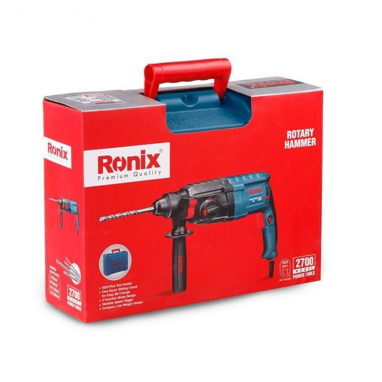 چنانچه نیاز به سوراخکاری و تخریب مصالح ساختمانی از قبیل دیوار را دارید، باید از دریل بتن‌کن استفاده نمایید. بتن‌کن‌ها عمدتا جهت سوراخکاری دیوارهای سخت و مقاوم استفاده می‌گردد. افرادی که کارشان سوراخکاری مداوم دیوارهای بتنی است، استفاده از بتن‌کن را به علت قدرت و سهولت آن ترجیح می‌دهند. دریل بتن کن‌‌ها با توجه به کاربردشان دارای انواع مختلفی هستند. برای تخریب و سوراخکاری‌ها حجیم از دریل بتن کن‌های سنگین و کارهای نیمه سنگین از بتن کن‌های سبک‌تر استفاده می‌شود. دریل بتن کن رونیکس مدل 2700 یک بتن کن سبک با وزن 3 کیلوگرم محسوب می‌شود. این دستگاه توانی معادل 850 وات دارد که بیشتر در برق کشی ساختمان ، دکوراسیون داخلی ، تاسیسات ساختمان و.. مورد استفاده قرار می‌گیرد. سرعت دریل بتن کن 2700 رونیکس 0 الی 4000 دور در دقیقه می‌باشد. همچنین این دستگاه قابلیت استفاده از مته گردبر ا در مصالح ساختمانی را دارد. برای نصب مته ، قلم و گردبر به این محصول باید در نظر داشته باشید سه نظام این دستگاه از نوع SDS-Plus است و تنها ابزار‌‌هایی قابل نصب بر روی این دستگاه می‌باشند که دنباله آن حتما 4 شیار باشد. قفل سوئیچ تعبیه شده روی دستگاه کار با آن را راحت‌تر کرده است و کاربر می‌تواند بدون نگه داشتن کلید پاور دستگاه، آن را در حالت روشن قرار دهد. این دستگاه از قابلیت چرخش به سمت راست و چپ برخوردار است. این ویژگی در مواقعی که مته در سطحی سخت، گیر می‌کند کمک زیادی به خارج کردن آن خواهد کرد. همچنین جهت راحتی کاربر، دسته گردان 360 درجه نیز روی این بتن کن نصب شده است. شرکت رونیکس به همراه این دریل بتن کن یک کیف BMC مقاوم و نیز سه عدد مته مته های 4شیار سایز 150×7 ، 150×8 ، 150×10 ، 200×12 میلی متر باکیفیت ،جهت سوراخکاری و تخریب ارائه کرده است. بی شک دریل بتن کن رونیکس یکی از باکیفیت ترین و پر فروش ترین دریل بتن کن های چهار شیار می‌باشد که توسط این شرکت عرضه می‌شود