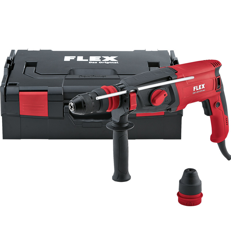 دستگاه CHE 2-28 R SDS-plus یک دریل بتن کن حرفه ای از محصولات شرکت «فلکس» (Flex) با بیش از 100 سال سابقه و مخترع سنگ فرز می باشد.این ابزار با انرژی 2.7 ژول، سرعت بدون بار این ابزار 1300-0 دور در دقیقه و نرخ ضربه آن 4000-0 ضربه در دقیقه ارائه می گردد. ابزار گیر استاندارد این دستگاه SDS-plus (چهار شیاره) است اما ابزارگیر آن قابل تعویض بوده و می توان سه نظام معمولی تا سایز 13 میلیمتر بر روی آن استفاده کرد. لازم به ذکر است سه نظام معمولی به همراه این محصول ارائه می گردد. این دستگاه دارای کلید چهارحالته است که قابل تنظیم در حالت های سوراخکاری، سوراخکاری چکشی ، بتن کن و تنظیم زاویه قلم (CHISEL) میباشد. وزن این دستگاه تنها 2.8 کیلوگرم بوده و داخل کیف بسیار محکم L-BOXX136 این ابزار 1 عدد سه نظام فلزی BF CHE 2 به قطر 1.5-13 میلیمتر،1 عدد سه نظام SDS-Plus(چهار شیاره) به همراه محدود کننده عمق و یک دسته کمکی وجود دارد. شرکت فلکس در سال 1922 در منطقه Bad Cannstatt نزدیک اشتوتگارت آلمان توسط Ackermann و Schmitt تاسیس گردید. در همان سال سنگ فرز MS6 با شفت Flexible و در سال 1954 اولین سنگ فرز سرعت بالای دنیا تحت عنوان DL9 توسط شرکت فلکس اختراع شد. هم اکنون شرکت فلکس معروفترین و معتبرترین تولید کننده پولیشر برقی و شارژی محسوب گردیده و تخصص آن تولید انواع ابزارآلات برقی و شارژی در صنایع خودرو، کار با فلزات، پرداخت سنگ و ابزارآلات مرتبط با ساخت و ساز و بازسازی می باشد.