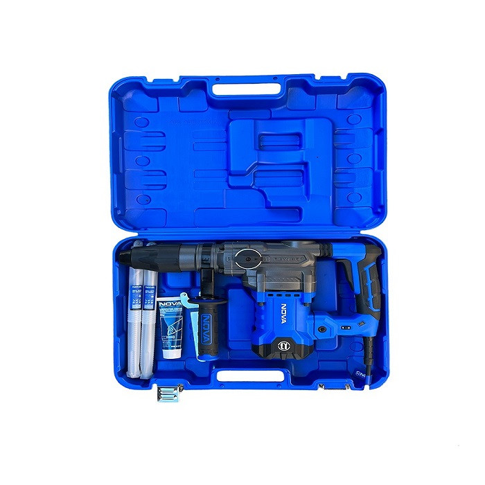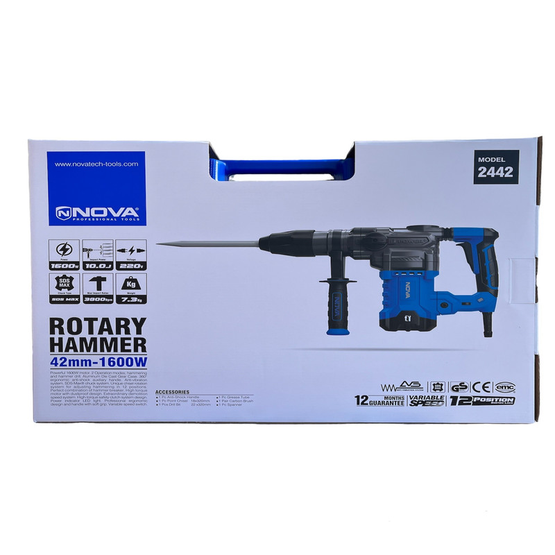 | سایر توضیحات | بتن کن نووا 2442 مجهز به موتور قدرتمند با توان 1600 وات تمام مس این بتن کن نووا 2442 قابلیت ایجاد توان ضربه ای به میزان 10 ژول را دارد سیلندر بزرگ و آرمیچر و بالشتک صنعتی تحت استاندارد CE اروپا بتن کن نووا 2442 مجهز به به کلید ضد گرد و غبار گازی تنظیم دو حالت سوراخ کاری ضربه ای (چکشی) و تخریب ابزار گیر بتن کن نووا 2442 5 شیار صنعتی (SDS MAX) دارای تنظیم کننده جهت قلم (VARIO LOCK) در 12 حالت مختلف چراغ LED نشانگر سرویس تنظیم سرعت (Variable Speed) و تنظیم جهت چرخش آلیاژ بدنه بتنکن نووا 2442 از آلومینیوم دایکاست تقویت شده برای محفظه سیلندر جهت انتقال بهتر حرارت و افزایش استحکام بدنه سرعت تخریب کاری بالا با توان 3800 ضربه در دقیقه ظرفیت سوراخ کاری در بتن 42 میلیمتر مجهز به سیستم ضد لرزش (AVS) این بتن کن 2442 دارای دسته گردان 360 درجه ضد لغزش طراحی پیشرفته جهت عدوم ورود گرد و غبار از قسمت تحتانی دستگاه سیستم پیشرفته چرخش بهتر گریس دارای کیف مقاوم BMC نگهداری و حمل و نقل آسان تولید شده تحت استانداردهای CE، GS و EMC کابل برقی با روکش ضخیم از جنسRubber و دوشاخه صنعتی طراحی سیستم ایمنی کلاچ با مقاومت بالا در برابر اضافه بار طراحی ارگونومیک دسته با روکش ضد لغزش |