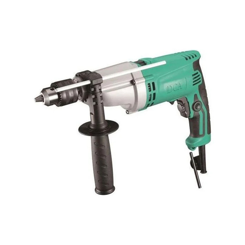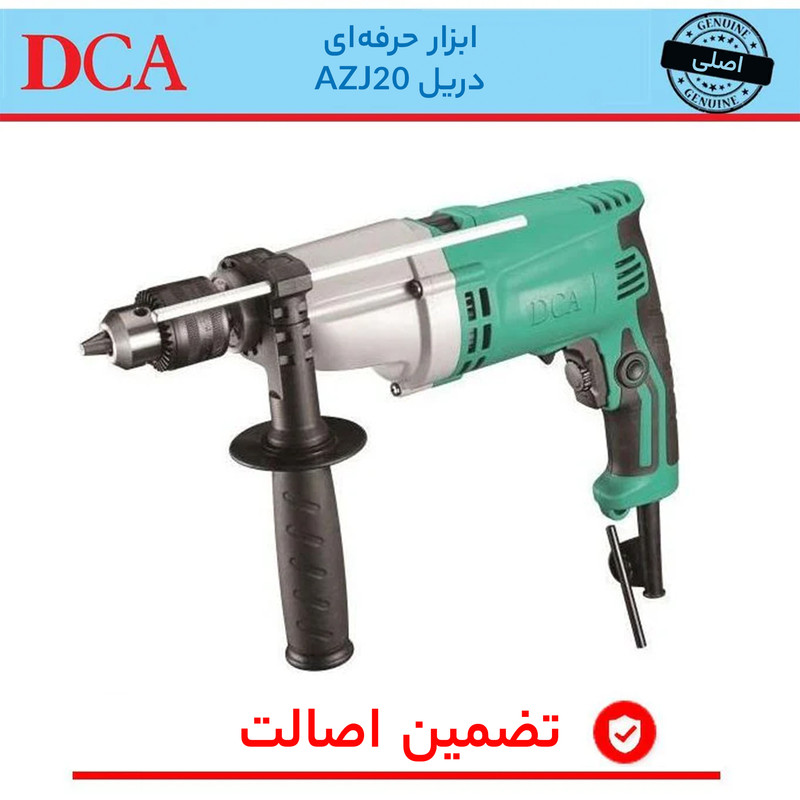 « دریل برقی دی سی ای مدل AZJ20 » دارای موتور 720 وات عمدتا جهت کاربری خانگی و نیز صنعتی جهت سوراخکاری چوب ، آهن و بتن استفاده می‌شود. با گذاشتن کلید بر روی حالت چکشی، به راحتی می‌توان سوراخکاری بر روی مصالح ساختمانی از قبیل دیوارها را انجام داد. به دلیل وجود حالت چکشی، جهت راحتی کار، دسته گردان 360 درجه نیز بر بروی این دریل وجود دارد. ای دریل دارای کیف مقاوم جهت راحتی در حمل و نقل نیز هست. مصرفی‌ترین قطعه موجود در دریل، عمدتا ذغال آن است که یک جفت ذغال اضافه نیز به همراه این دریل ارائه می‌شود. این دریل دارای گیربکس دوحالته جهت تنظیم سرعت در دو حالت مختلف از 0 الی 1150 دور در دقیقه و نیز از 0 الی 2800 دور در دقیقه را دارا است. دریل برقی دی سی ای مدل AZJ20 دارای کلید الکترونیکی دیمر دار (قابل تنظیم مقدار گردش سه نظام) است تا با توجه به نیاز قدرت چرخش سه نظام را تنظیم نمود. همچنین این دریل دارای دکمه چپ گرد و راست گرد هست که برای دریل کاری در حالت چپ گرد و راست گرد استفاده می‌گردد. وجود قفل کن کلید نیز از دیگر خصوصیات این دریل جهت راحتی کاربر هنگام استفاده از این دستگاه برای مدت طولانی و مداوم است. تمامی مراحل ساخت موتور این دریل از قبیل آرمچر و بالشتک با استفاده از دستگاه‌های تمام اتوماتیک منطبق با آخرین فناوری روز دنیا تولید شده تا عمر مفید دستگاه به حداکثر برسد. بدنه این دستگاه دارای طراحی ارگونومیک جهت خوشدستی و راحتی کاربر در حین کار طراحی شده و همچنین این بدنه عایق دویل بوده و از جنس PA6+GF30 که بهترین مواد جهت ساخت بدنه ابزار آلات برقی هست استفاده شده است. با اعمال عملیات گرمایشی استاندارد و سخت کاری بر روی دنده‌های این دریل، همواره سعی شده تا دنده‌ها تقویت شده وعمر دنده‌ها افزایش یابد.