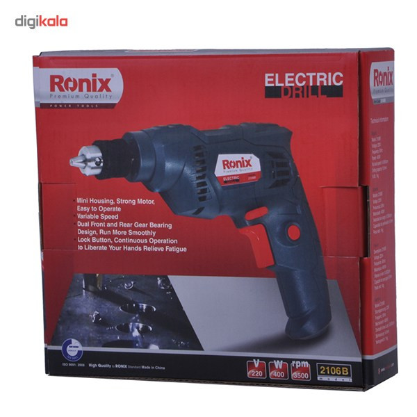 دریلها ازجمله ابزارهای کاربردی محسوب میشوند که وجود آنها در هر خانهای موردنیاز است. این دستگاهها انواع بسیار گوناگونی دارند و برای انجام کارهای مختلفی مورداستفاده قرار میگیرند. درصورتیکه به شکلی حرفهای با دریل کار نمیکنید، میتوانید دریلی ساده را تهیه کرده و در مواقع موردنیاز از آن استفاده کنید. محصولی که در تصویر مشاهده میکنید برای چنین منظوری بسیار مناسب است. این دستگاه دریل شرکت «رونیکس» (Ronix) است که تحت عنوان «2106B» تولید میشود. این دریل توانی برابر 400 وات داشته و با برق شهری کار میکند. سرعت گردش این دستگاه 3500-0 دور بر دقیقه بوده و با کمک کلیدی میتوانید جهت چرخش آن را تغییر دهید. این دستگاه وزن سبکی برابر 1 کیلوگرم دارد و بر اساس استاندارد CE (استاندارد اروپا) تولید میشود. شرکت رونیکس برای راحتی بیشتر کاربر، این دستگاه را به قفل سوییچ مجهز کرده است. با کمک این کلید، دیگر نیازی به نگهداشتن شاسی دریل برای سوراخکاری ندارید، سهنظام دستگاه بهطور مداوم میچرخد و شما با تسلط و قدرت بیشتری میتوانید عمل دریلکاری را انجام دهید. سهنظام این دریل از نوع 6.5 میلیمتری بوده و برای باز و بسته کردن مته باید از آچار استفاده کنید. این محصول در برابر گردوغبار نیز عایق است.